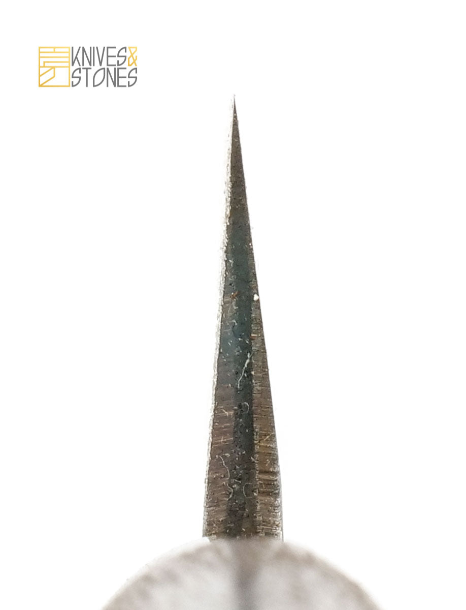- Thick spine at the heel, aggressive taper to the tip, compound with a very thin grind behind the edge, giving the knife excellent cutting performance with great food release.