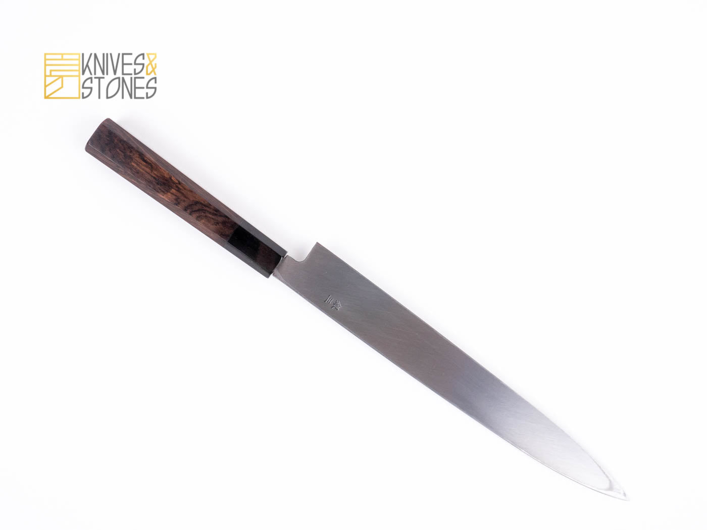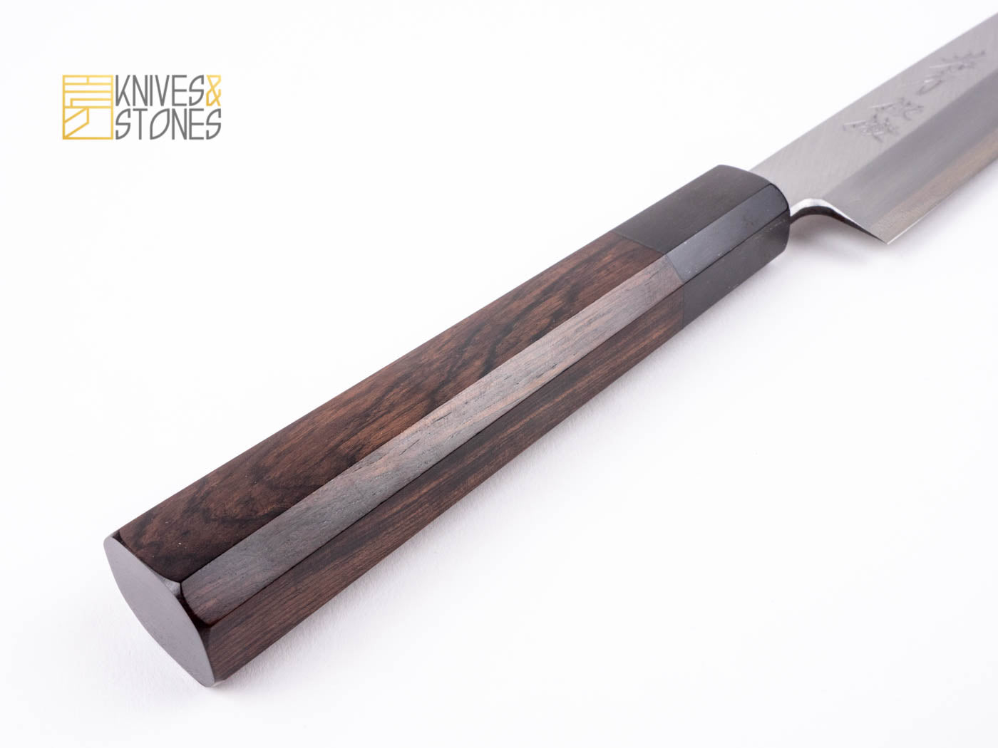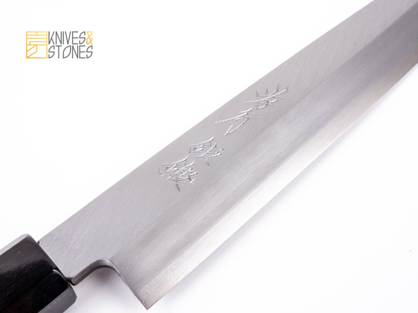 The Gintan (銀鍛) is a K&S special order from Takayuki that has a improved overall package, such as a ebony handle and hand engraved kanji, yet maintains a very competitive pricing.