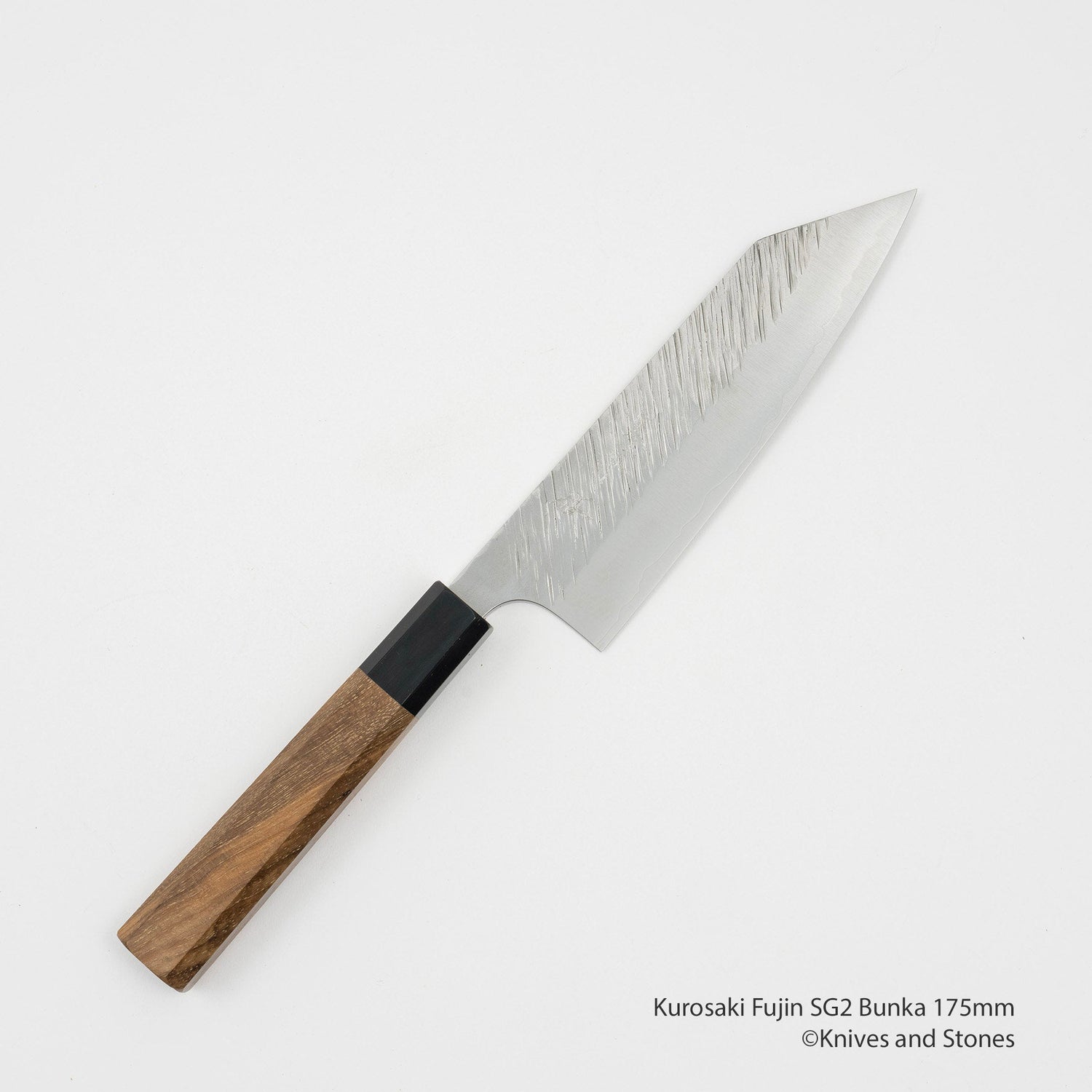 The Kurosaki Fujin has a unique diagionally forged tsuchime (hammered) pattern by Kurosaki called 'Fujin' (Wind of the God). The visual is highly appealing, combined with Kurosaki's excellent cutting performance, and a rare SG2 powdered steel, this variant is highly sought after.