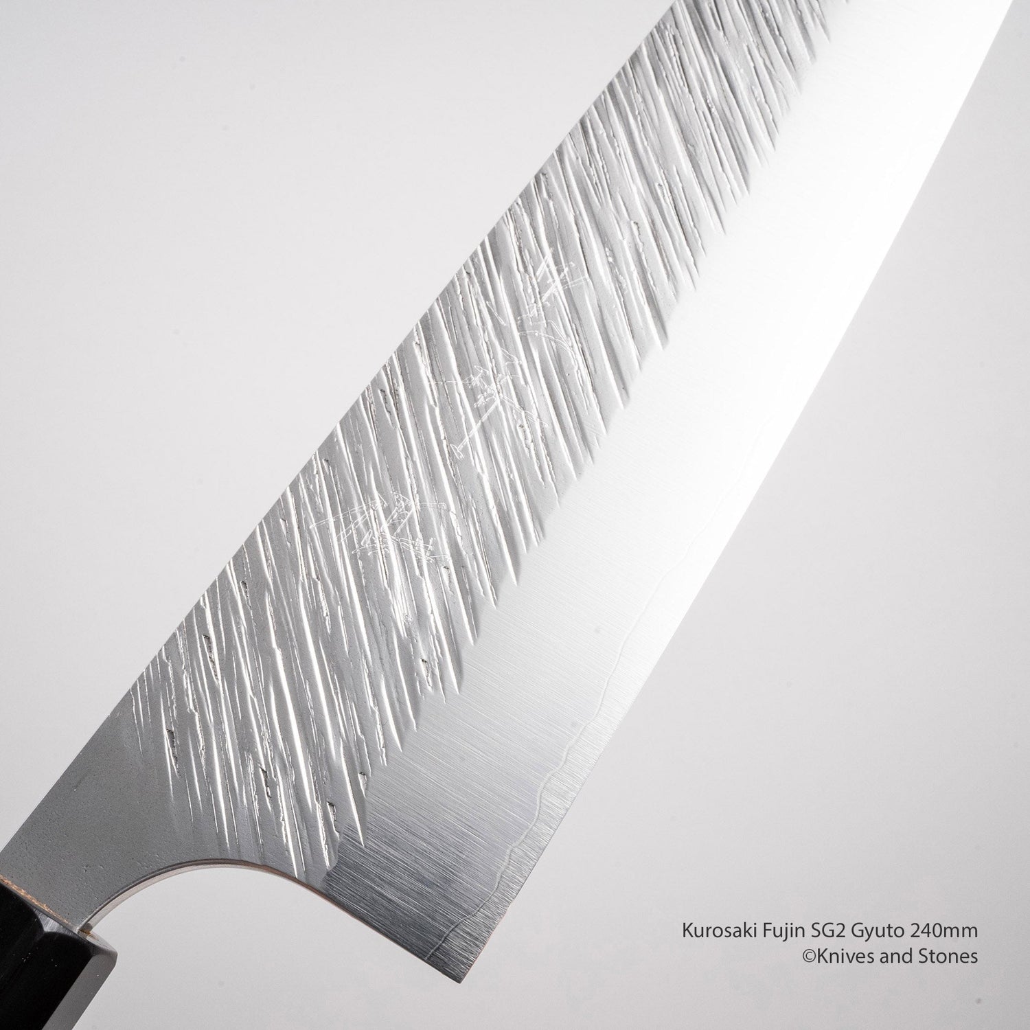 The Kurosaki Fujin has a unique diagionally forged tsuchime (hammered) pattern by Kurosaki called 'Fujin' (Wind of the God). The visual is highly appealing, combined with Kurosaki's excellent cutting performance, and a rare SG2 powdered steel, this variant is highly sought after. Kurosaki raised to fame with three signature hammered patterns: the Shizuku, Fujin and Raijin. In recent years, there have been very little production of these three lines and due to the high demand of Kurosaki??s work, they are seldomly available. We recently received a small batch of the Fujin, and while the initial bathes were in Aogami Super, this batch of Fujin is the more desirable Takefu powdered SG2.
