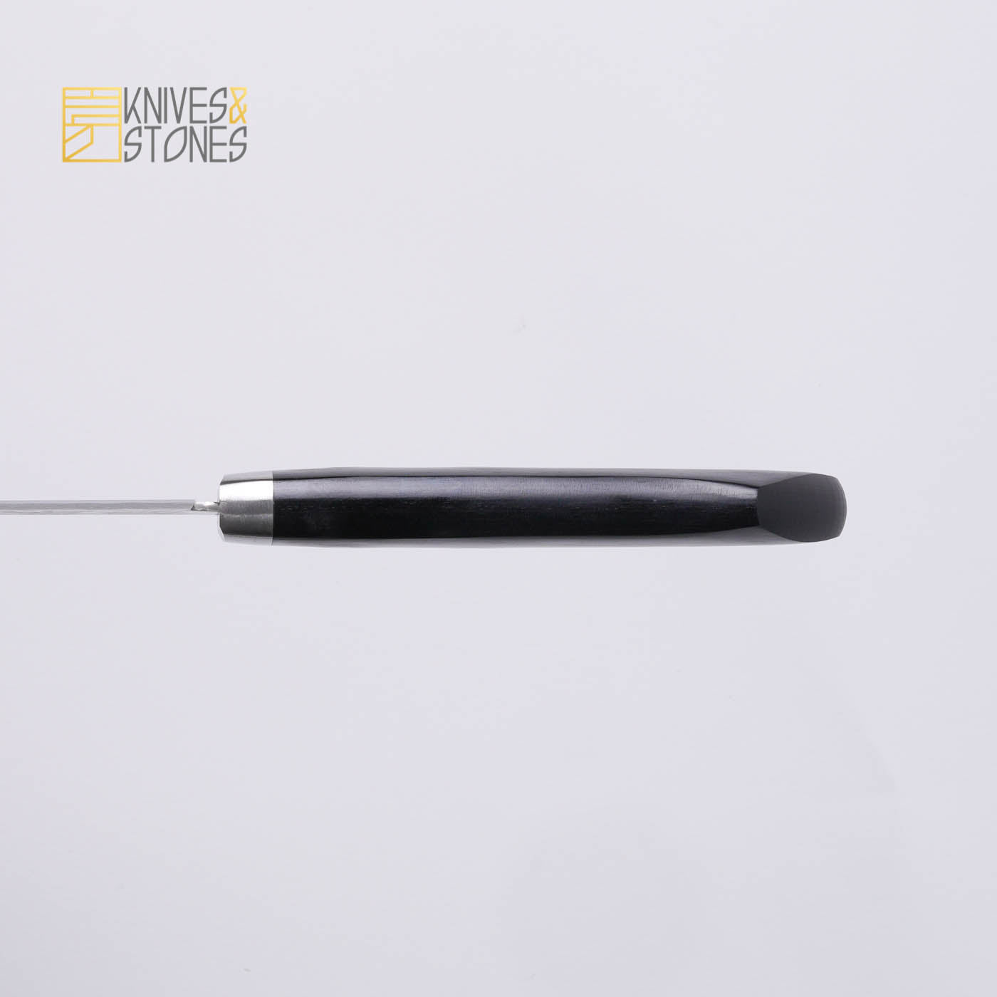 Cladded in soft stainless steel, the knife has VG10 steel core which is the most popular steel in Japanese kitchen. With thin grind behind the edge, the Masutani is more like a laser to allow you can cut through food effortlessly.