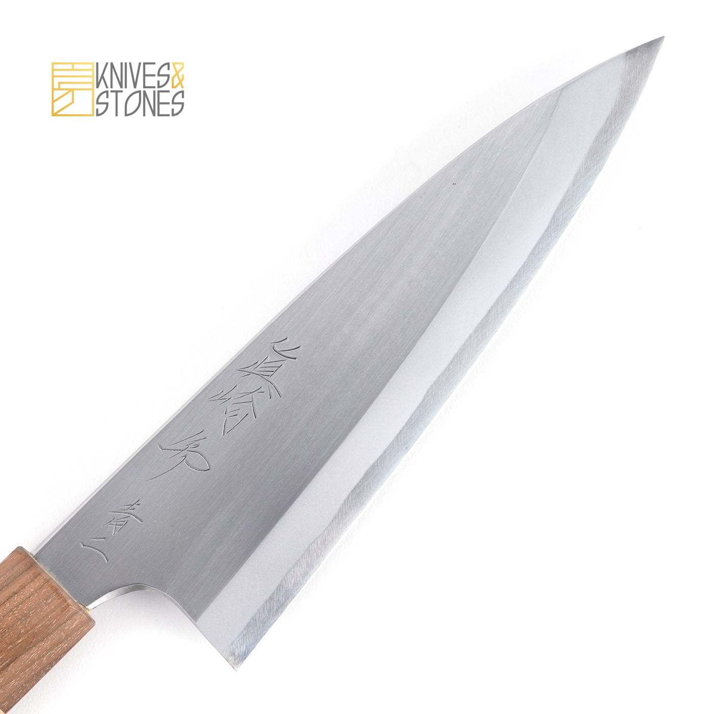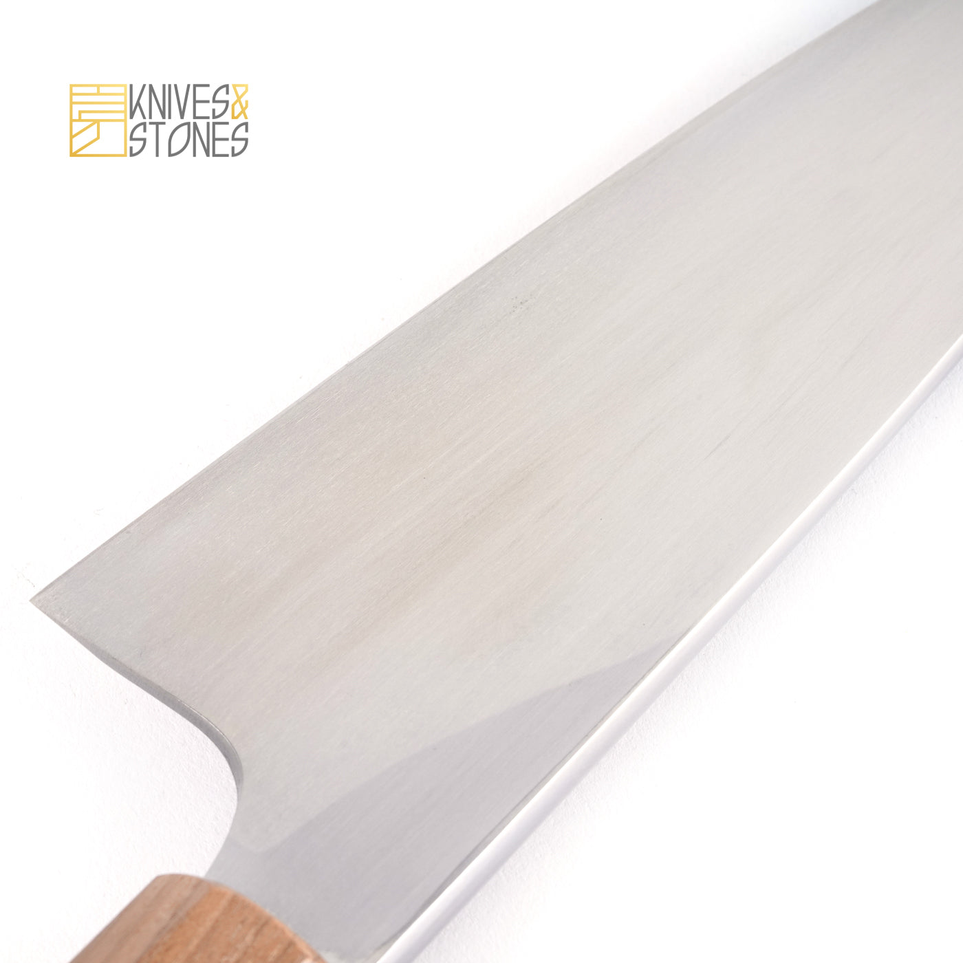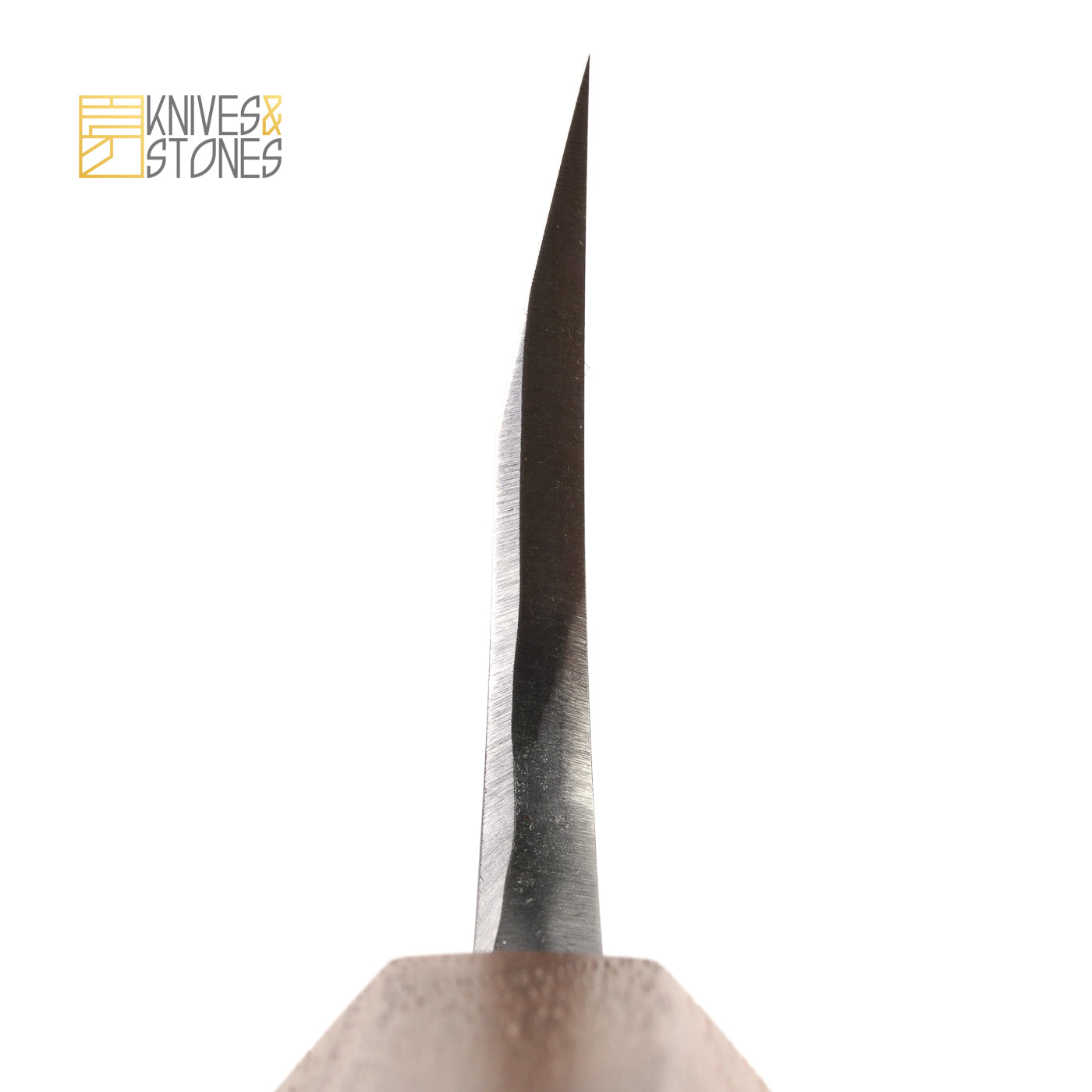 A while ago I was able to sample his latest work and was thoroughly impressed by how much it has improved. His knife now cuts much better than his earlier ones. I am particularly impressed that Mazaki's knife is largely finished on a stone by hand, while it is a much more time consuming process, such process ensures the knife is straight and flat with minimal low spots. We are talking about a type of finishing that is very much like Shigefusa's final handle sharpening process (albeit not the same level of polishing), rather than a water grinder sharpening process, which creates uneveness and low spots along the blade road, and sometimes even worse: over-grind. Given the effort that Mazaki-san has put in, the production is understandably very limited, and given the low price, I am sure his work will be highly thought after veyr soon.