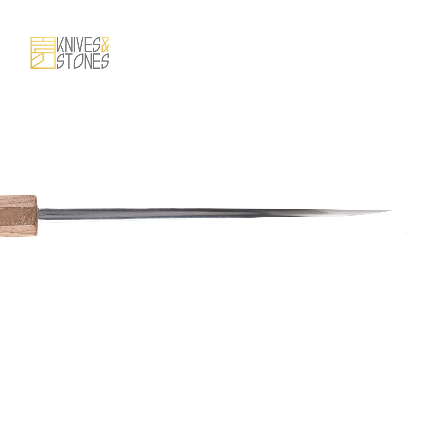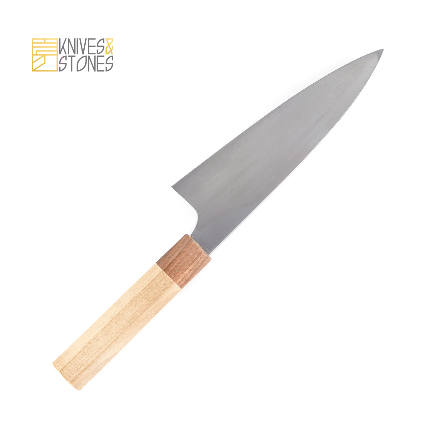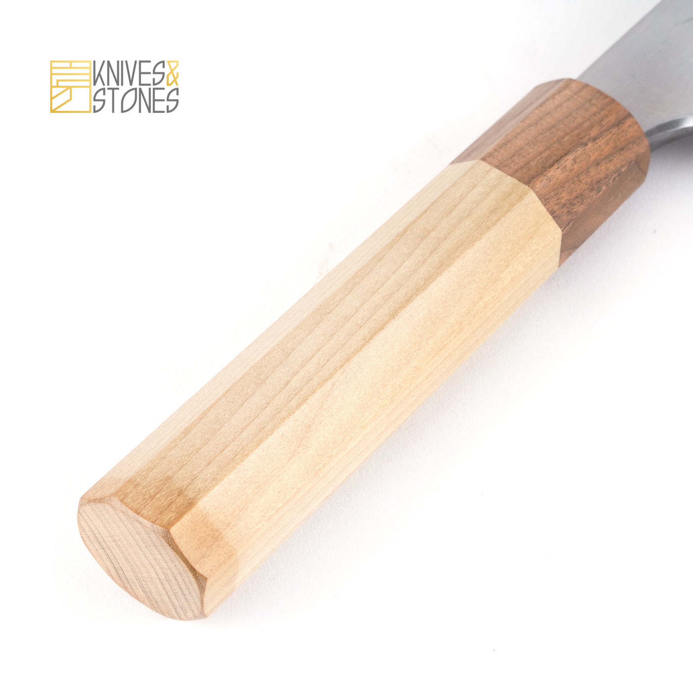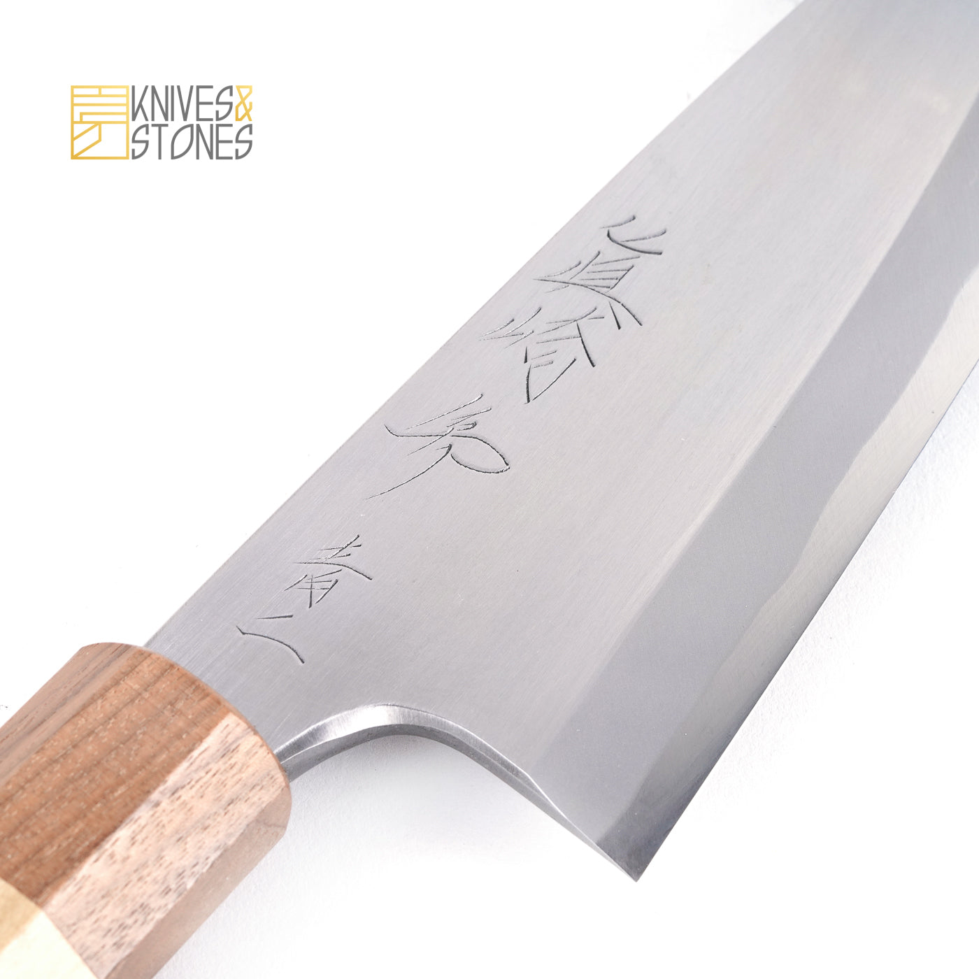 A while ago I was able to sample his latest work and was thoroughly impressed by how much it has improved. His knife now cuts much better than his earlier ones. I am particularly impressed that Mazaki's knife is largely finished on a stone by hand, while it is a much more time consuming process, such process ensures the knife is straight and flat with minimal low spots. We are talking about a type of finishing that is very much like Shigefusa's final handle sharpening process (albeit not the same level of polishing), rather than a water grinder sharpening process, which creates uneveness and low spots along the blade road, and sometimes even worse: over-grind. Given the effort that Mazaki-san has put in, the production is understandably very limited, and given the low price, I am sure his work will be highly thought after veyr soon.