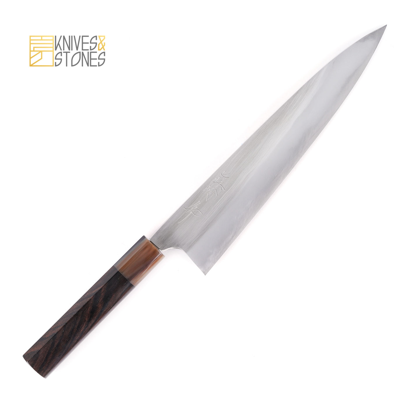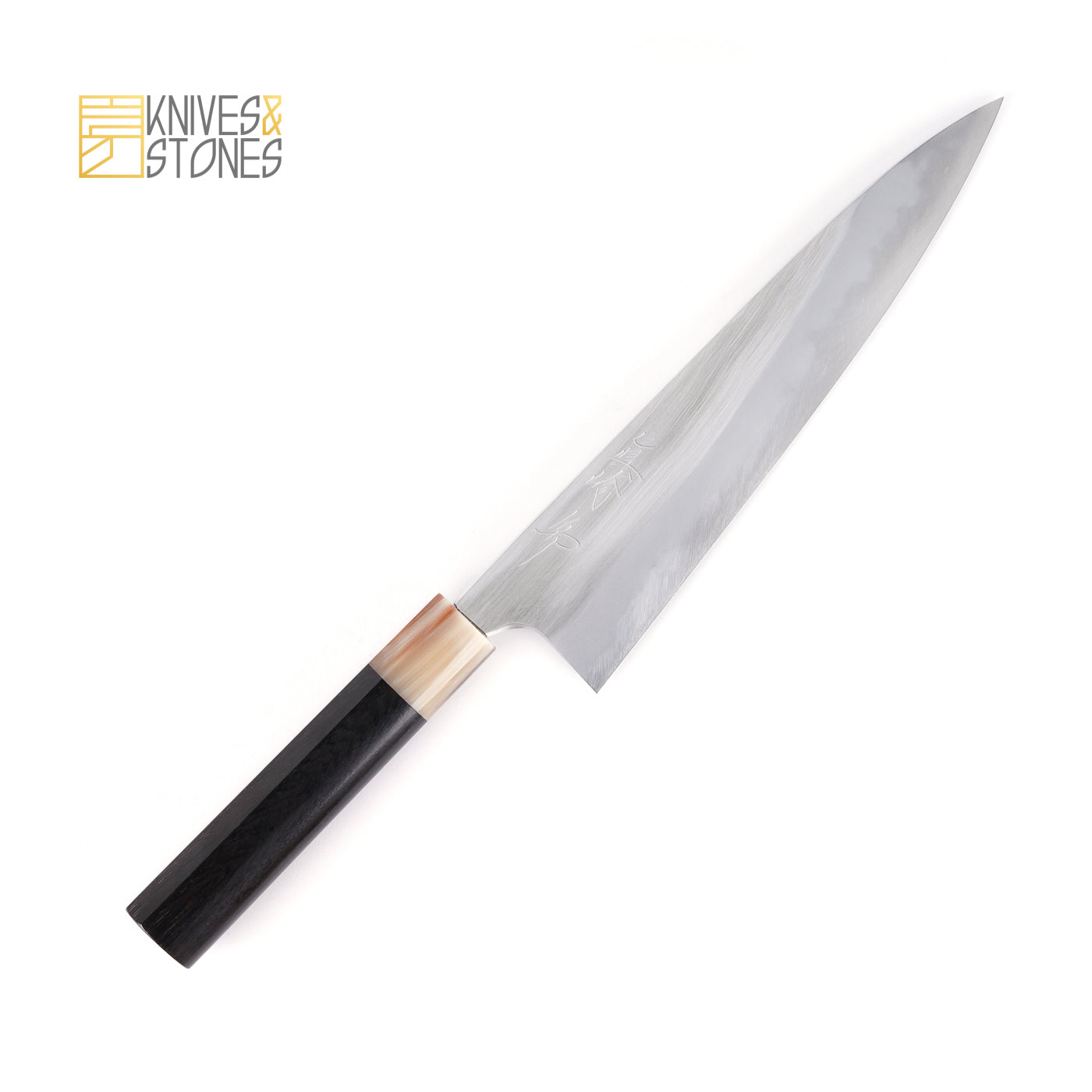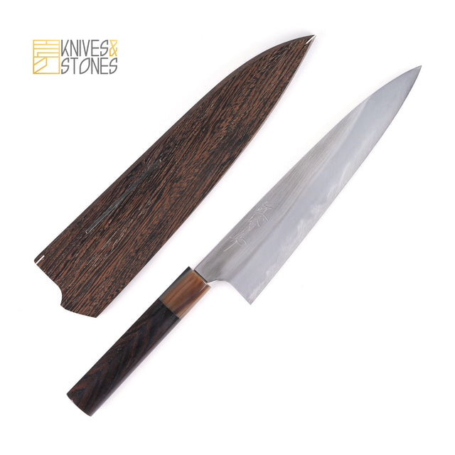 Mazaki Hon-Sanmai White 2 Gyuto 210/ 225/ 240 mm, with K&S Heart-shaped Ebony Handle and Wenge Wood Saya - 210mm is backordered and will ship as soon as it is back in stock.