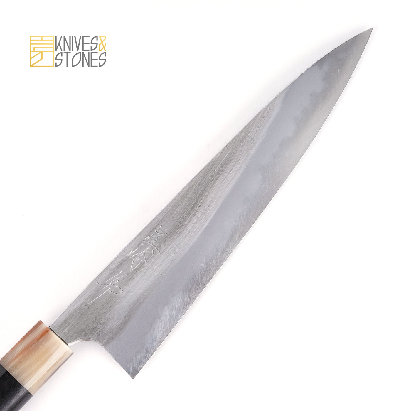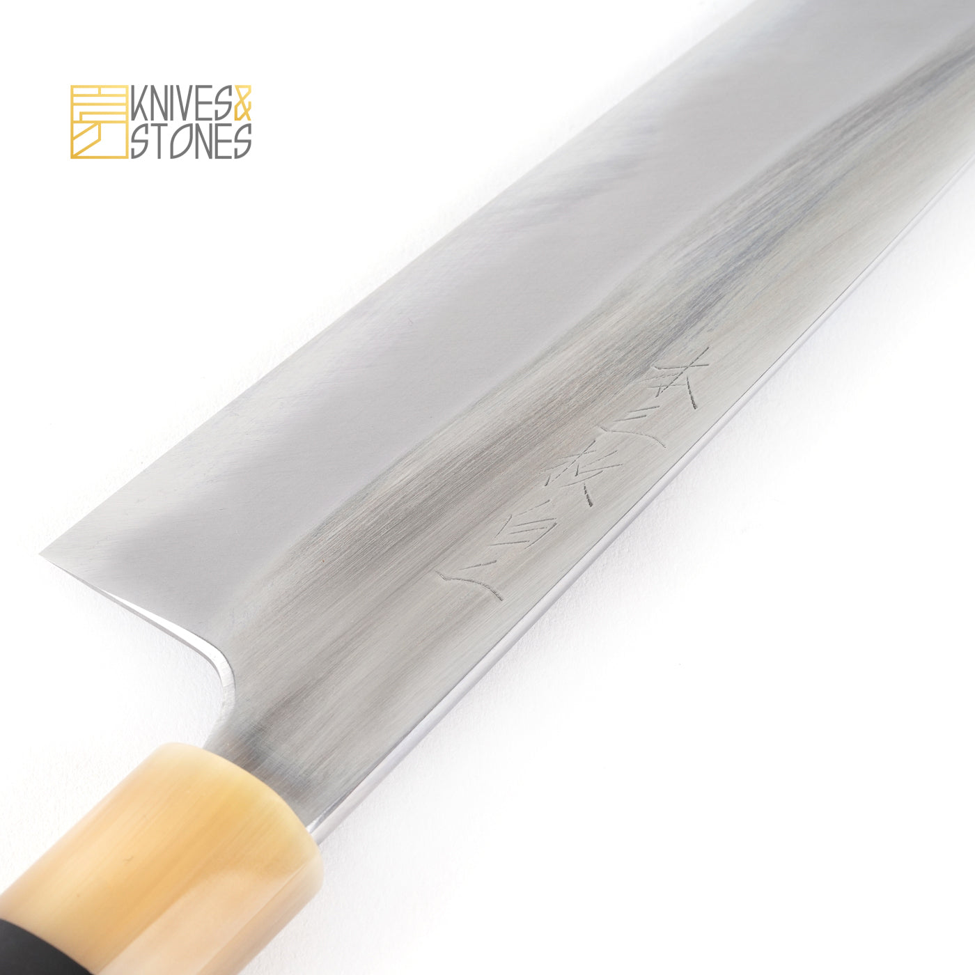 Rare hon-sanmai (本三枚)Gyuto. Hon-sanmai here means the sanmai (3-layer, for double bevel knife) billet is cladded by the maker using traditional forge welding method rather than using a pre-cladded billet from the steel factory. These days, most makers are using pre-cladded billets in order to speed up the production and reduce the chance of failure, because forge welding the iron clad with the steel is a point of failure during the knife making process, as the welding could fail if not done properly resulting in a crack forming between the cladding and steel, sometimes even a total split. (Another point of failure is during the heat treading process). As a result, cladding a sanmai billing can inherently be trickier than just doing a nimai (2 layer; for single bevel knife) billet.
