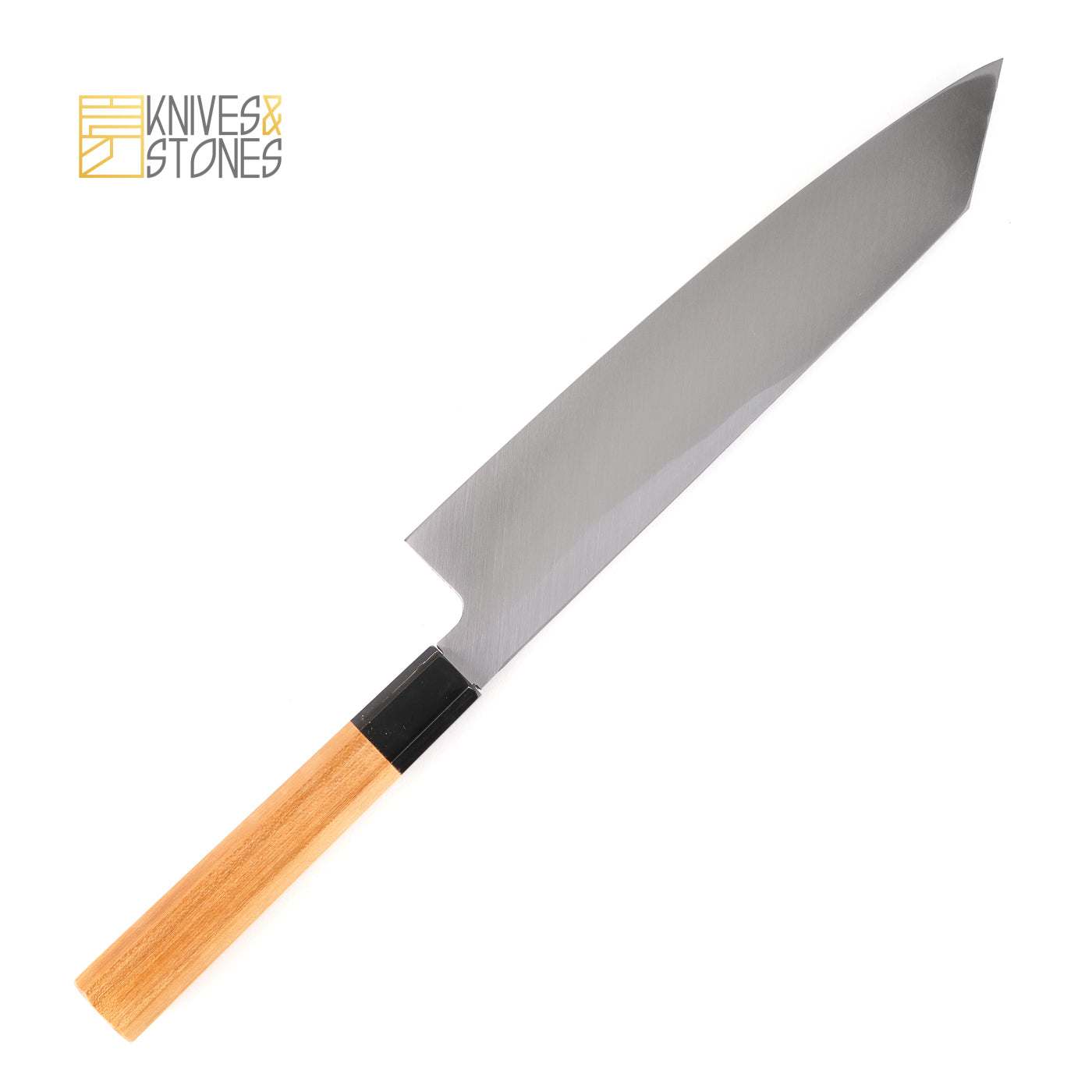 Blue 2 Sigle-Bevel K-Tip Gyuto with Kurochi Finish and Teak wood handle, by Myojin Riki.