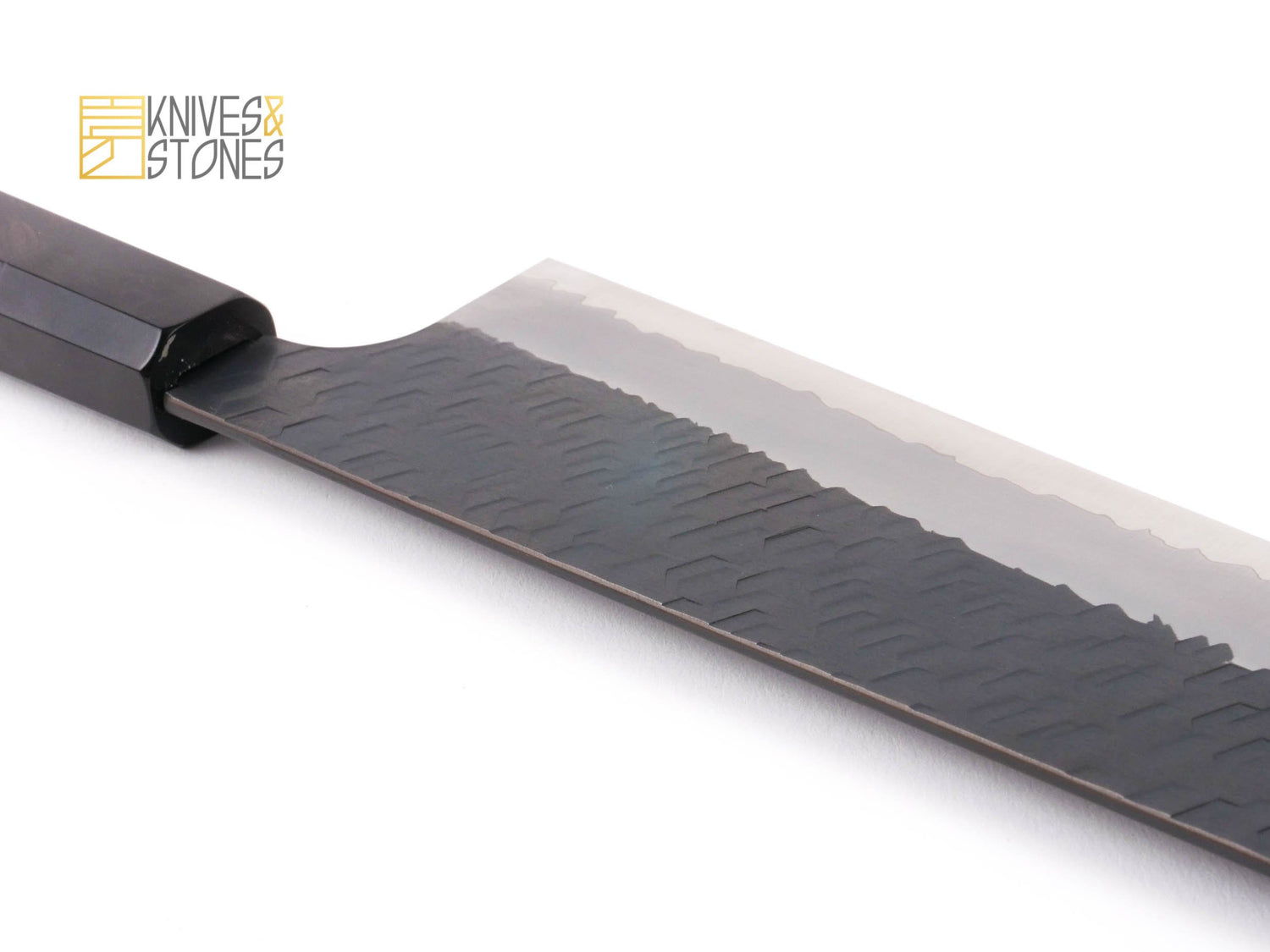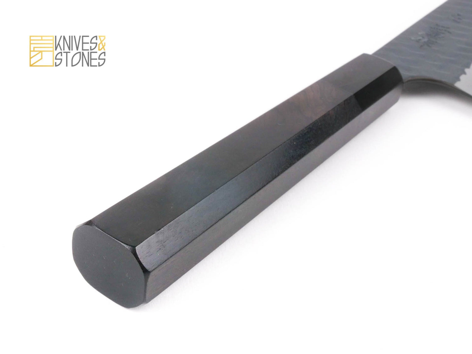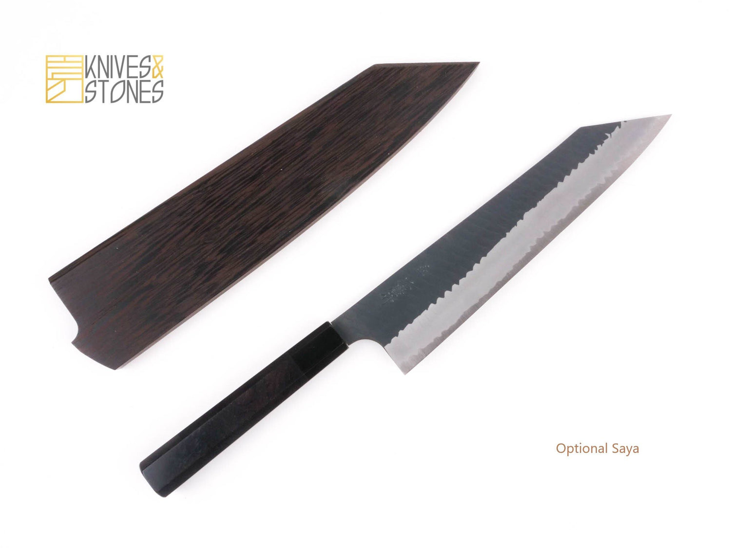 Nigara SG2 Kurouchi Tsuchime K-tip Gyuto 210/240/270mm, with K&S Ebony Handle - 210 mm is backordered and will ship as soon as it is back in stock.