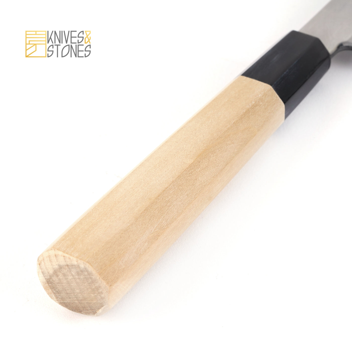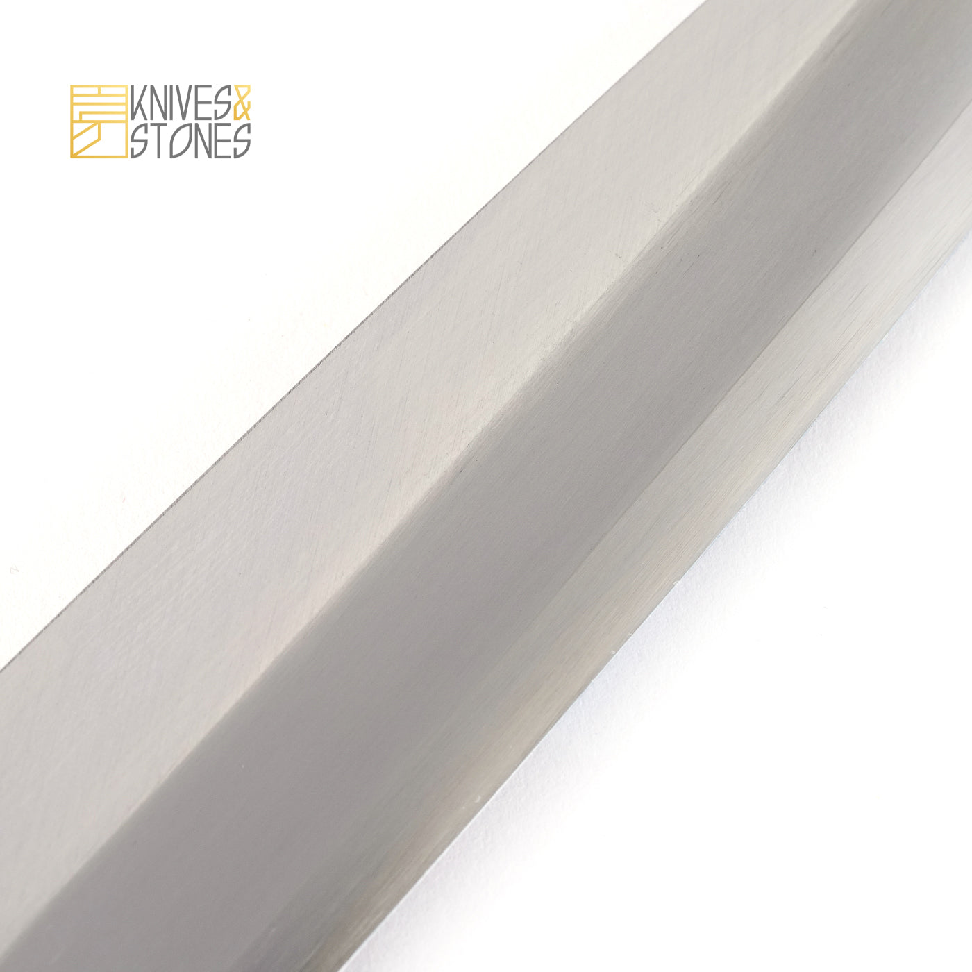 The Gintan (銀鍛) is a K&S special order from Takayuki that has a improved overall package, such as a ebony handle and hand engraved kanji, yet maintains a very competitive pricing.