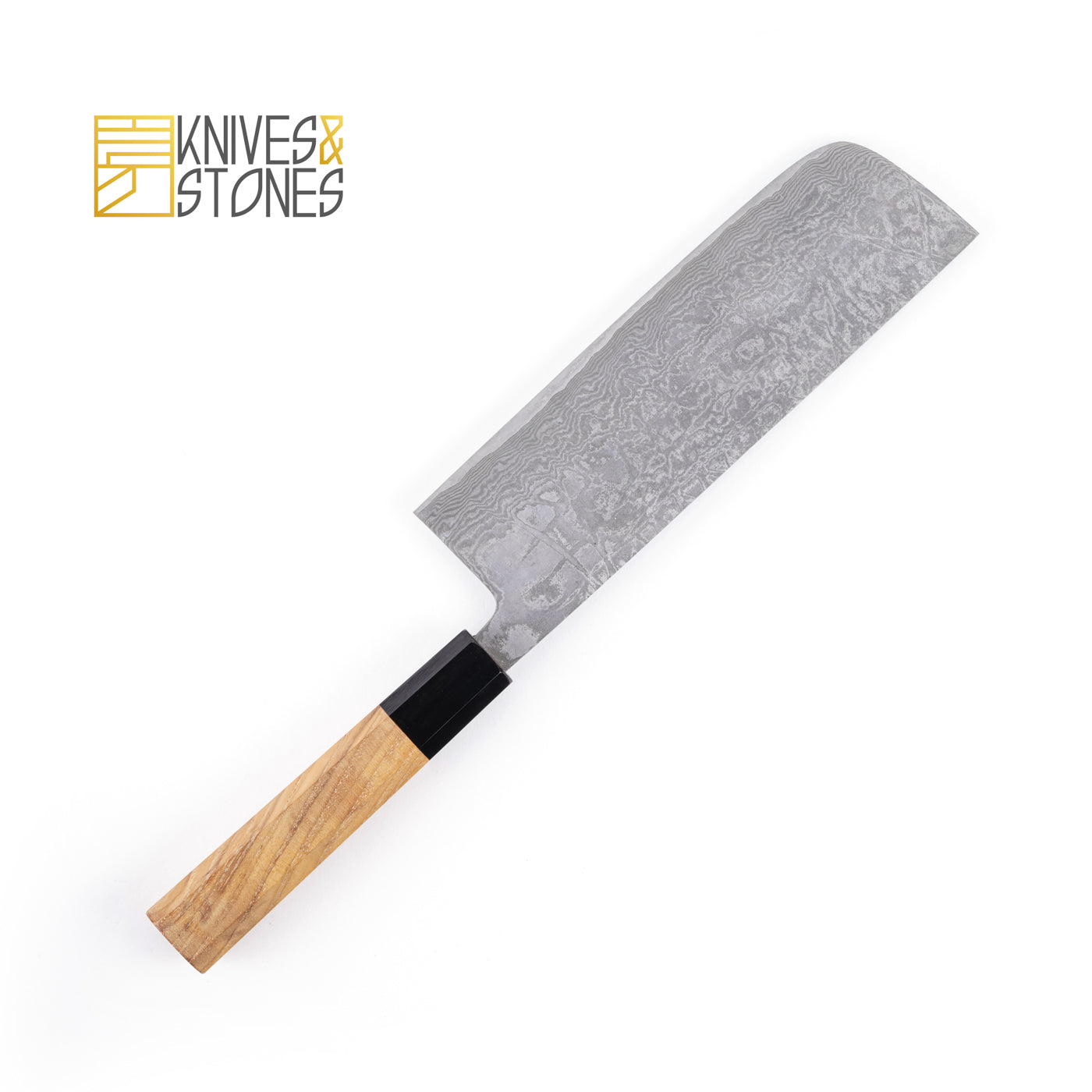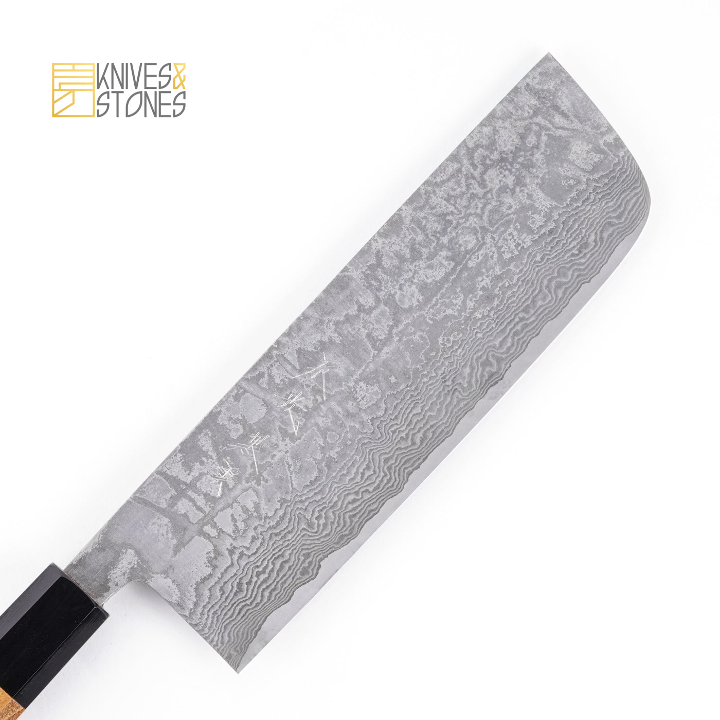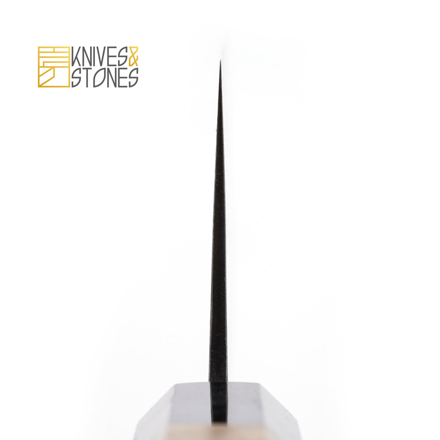 Now the beauty of sanmai construction kicks in. Sanmai literally means “three pieces”: a thin layer of core steel is sandwiched between two layers of soft iron or stainless steel. Doing so not only allows the knife to cut as good as a monosteel knife (core steel doing the work), but more importantly, enables the knife to be thinned with ease (removing the soft cladding rather than a hard steel with hardness over HRC 60). In the case of Syousin Suminagashi line, the soft cladding is even hand forged by Kamo-san with an eye catching Damascus pattern.