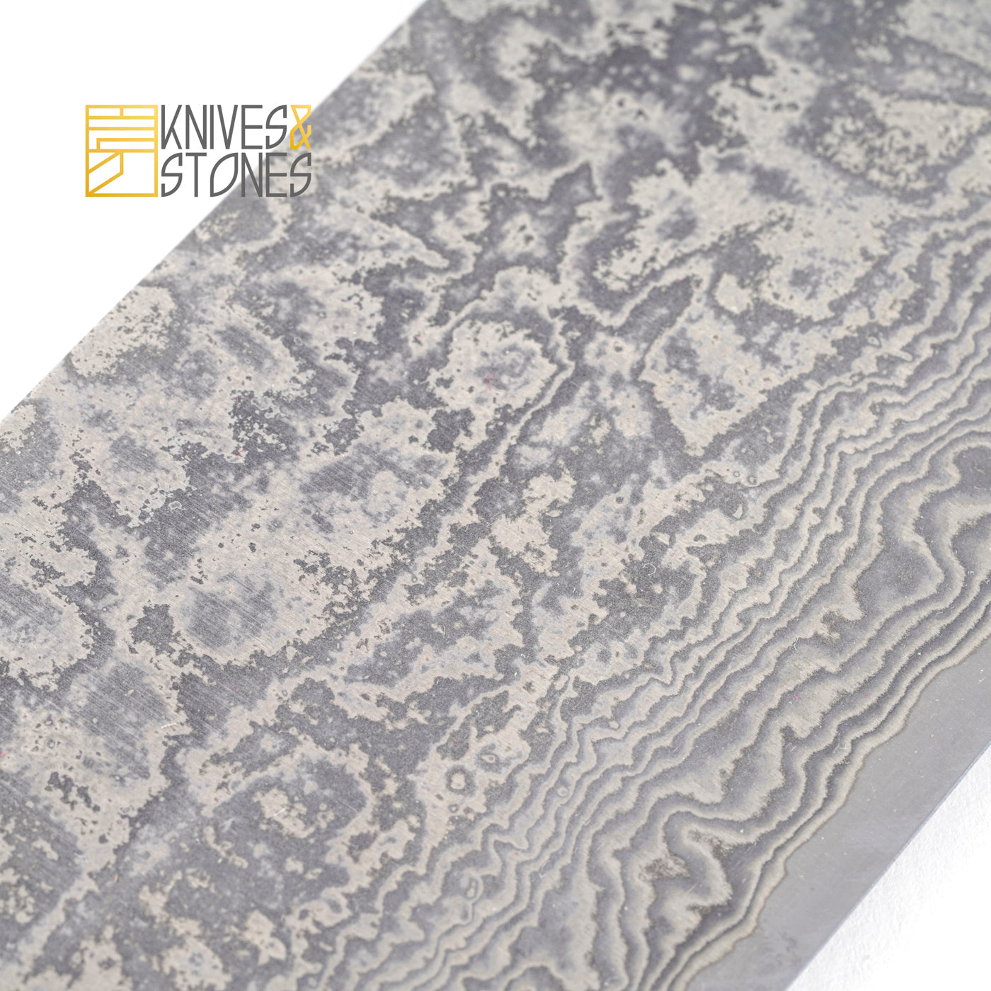 In this case of Shinko Kurokumo, Shinko (辰光) is the K&S in house brand and the Kurokumo (黑雲, black cloud) represents the acid etched damascus pattern. The knife itself is idential to the Syousin Suminagashi namely same profile, same grind and the same core-steel (R2).