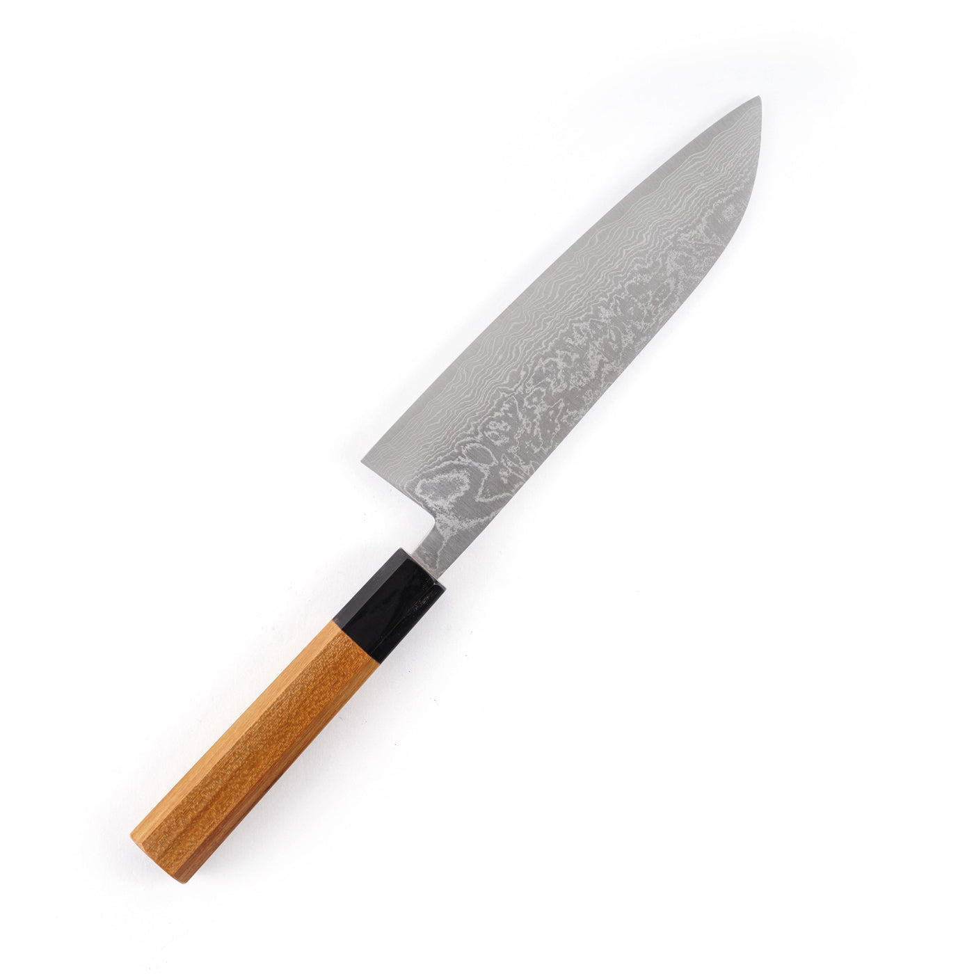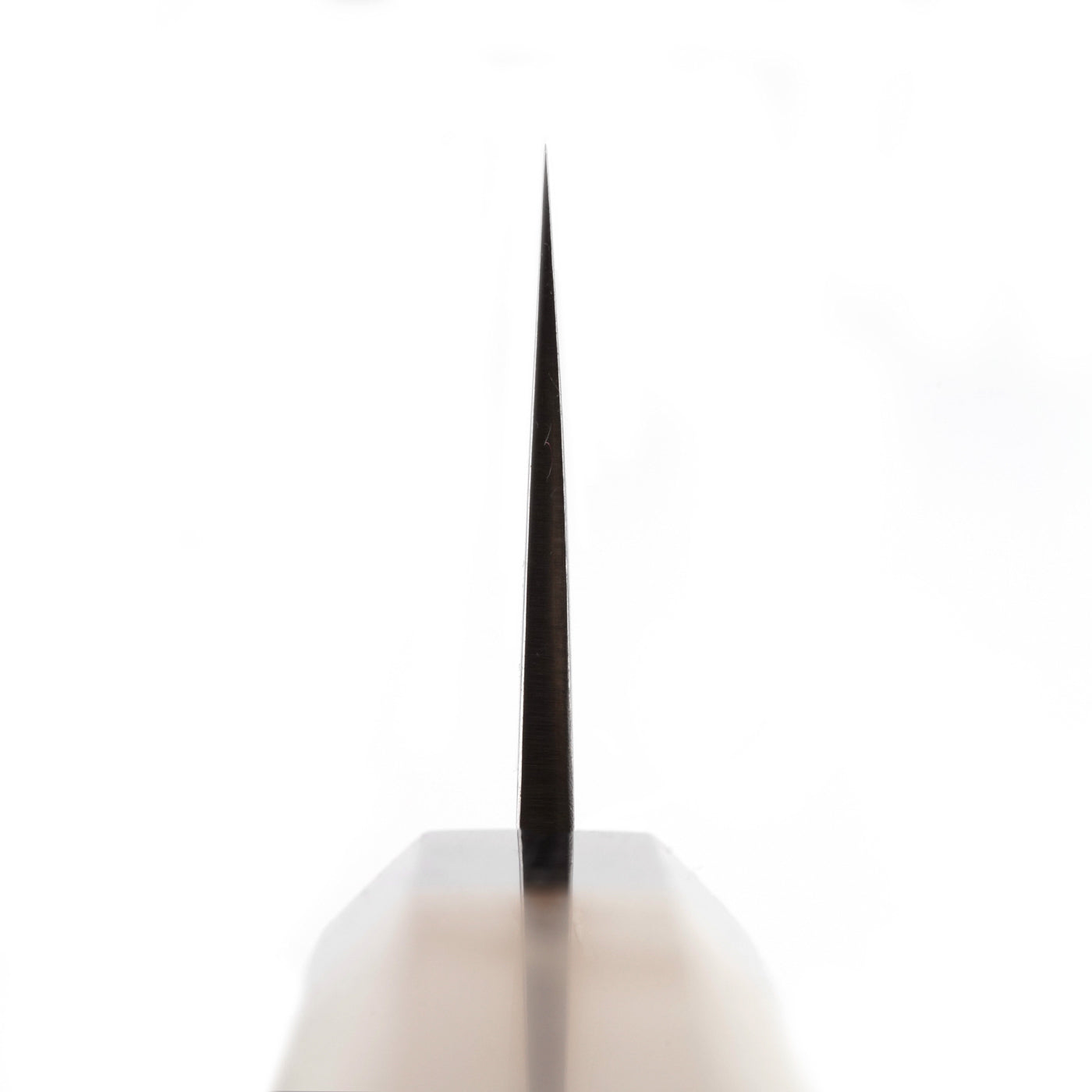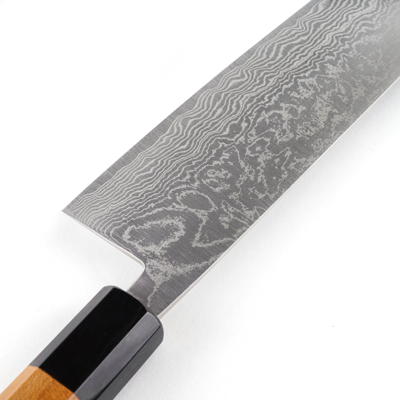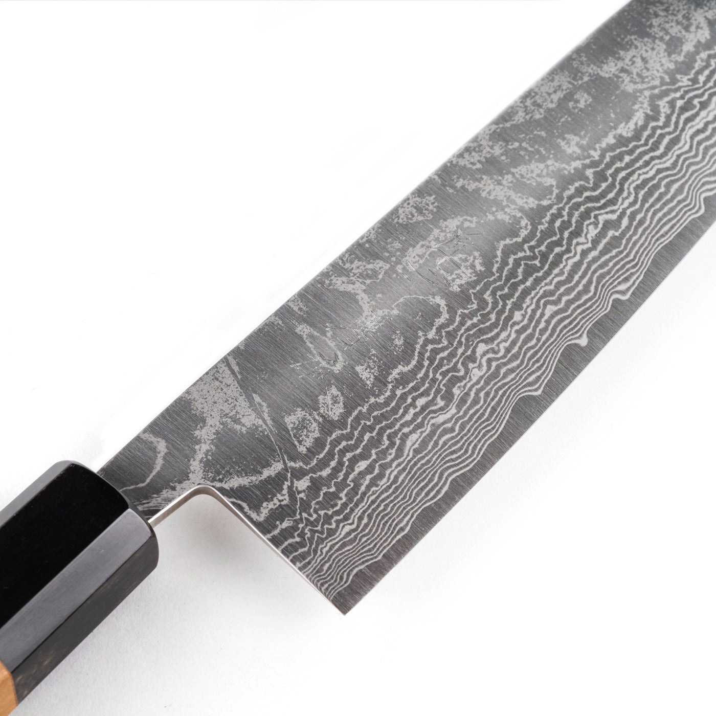 Now the beauty of sanmai construction kicks in. Sanmai literally means “three pieces”: a thin layer of core steel is sandwiched between two layers of soft iron or stainless steel. Doing so not only allows the knife to cut as good as a monosteel knife (core steel doing the work), but more importantly, enables the knife to be thinned with ease (removing the soft cladding rather than a hard steel with hardness over HRC 60). In the case of Syousin Suminagashi line, the soft cladding is even hand forged by Kamo-san with an eye catching Damascus pattern.
