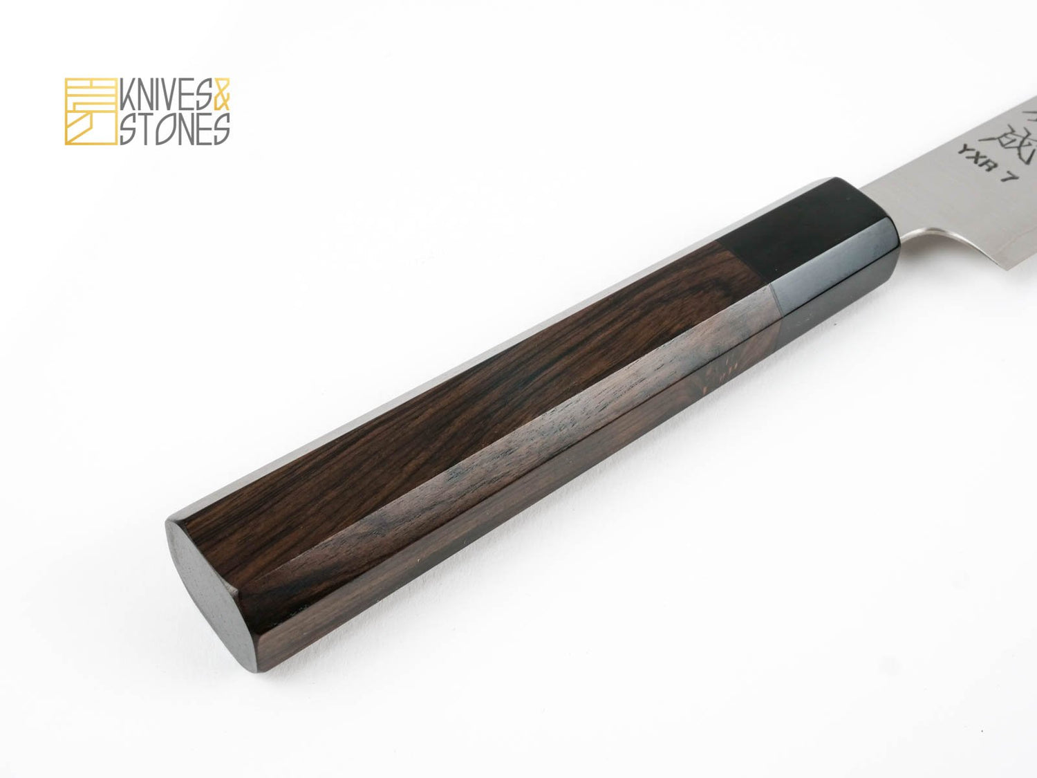 I am super excited to offer the Sukenari YXR7 as a K&S exclusive line, this is a very significant moment in the history of Knives and Stones. The YXR7 is a high hardness and high toughness steel that is very forgiving to use in a busy kitchen, gives carbon-like cutting feedback and sharpens just like a normal carbon steel. Sukenari is a proven choice when it comes to heat treatment and grind, and I have certainly enjoyed mine over the years. If you love your SLD or want to give semi-stainless steel a try, I certainly think is the probably one of the best offerings out there.