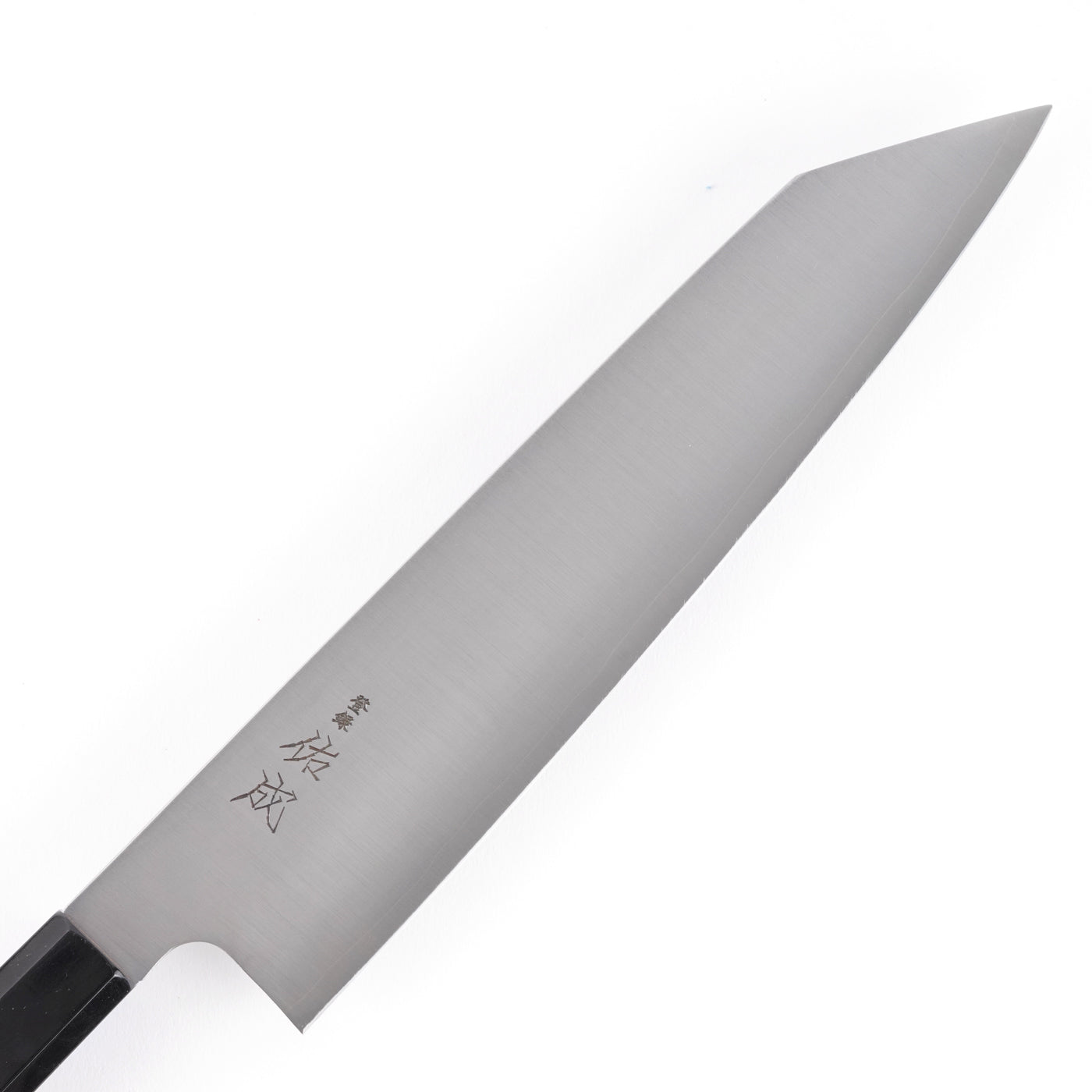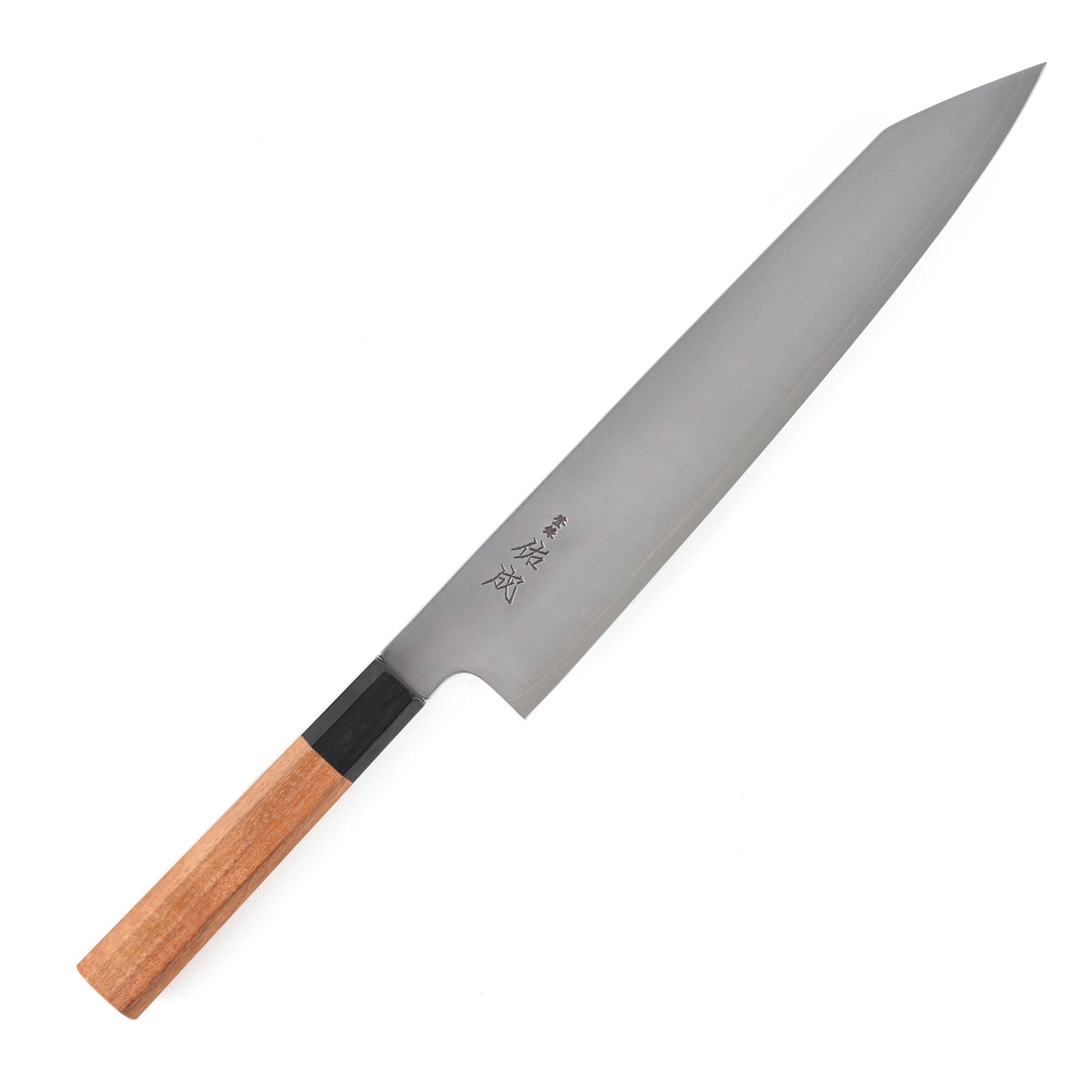 The gyu-hiki profile makes tall enough to be used as a versatile gyuto, yet slim enough to minimize dragging in food ingredient.