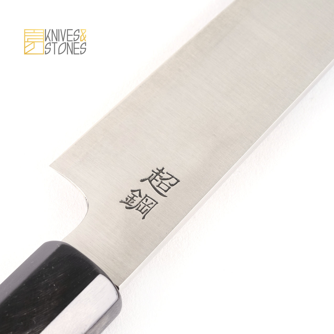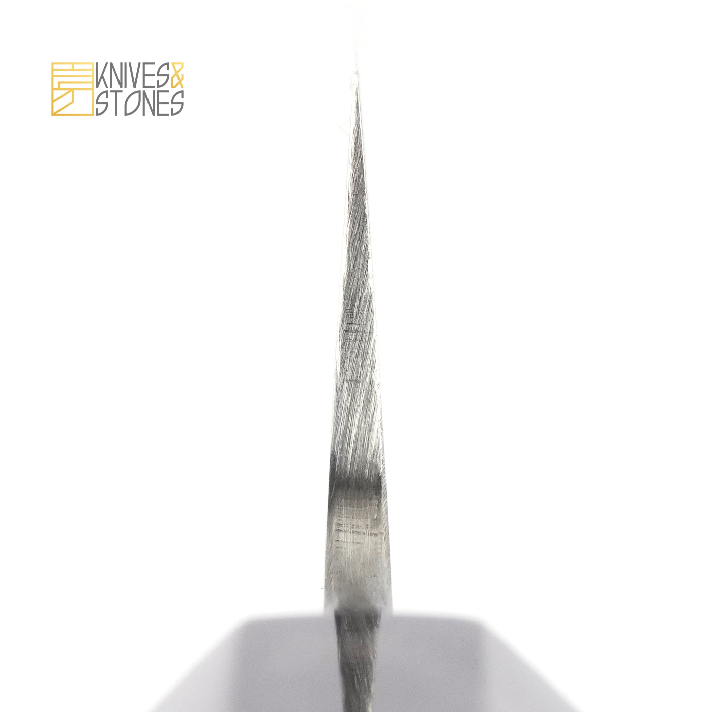 The Knives and Stones Sukenari ZDP-189 line is truely a beauty by the look, beast by the performance. The core steel is the most advanced powdered steel that Hitachi offers: the ZDP-189, reaching an unmatched hardness of HRC 65 to 67. This is acthieved by over 3% of Carbon content in the steel (White 2 has about 1%, Blue 1 has about 1.25%, that tells you something) meaning the Sukenari ZDP-189 will offer insance edge retention and sharpness. Yet it is a stainless steel becasue of the added Chromium. Overall, the ZDP-189 has very similar composition to the Cowry-X steel from Daido.