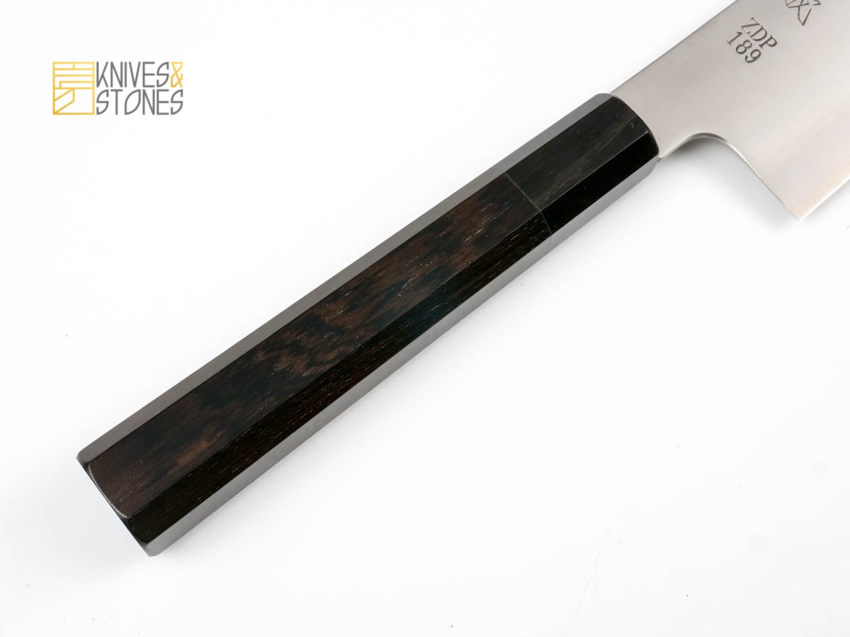 The ZDP-189 blade is forged with Nickel damascus stainless steel and mirror polished, along with the rounded choil and spine, super thin behind the edge, it is truely a master-piece from Master Hanaki Nobuo.