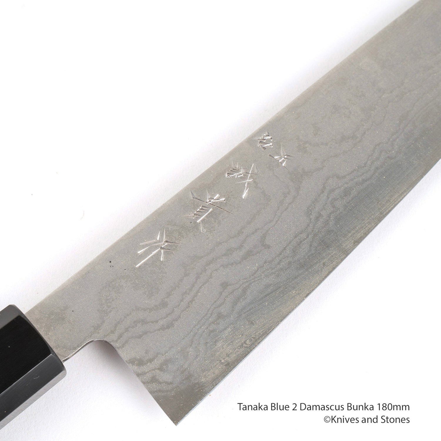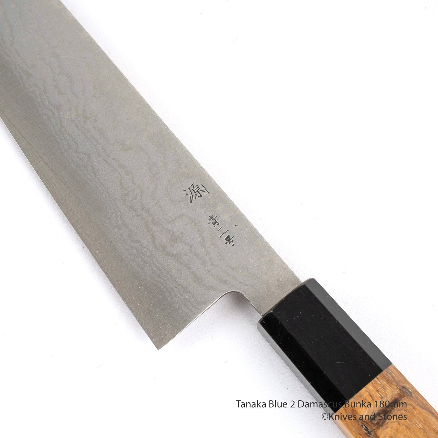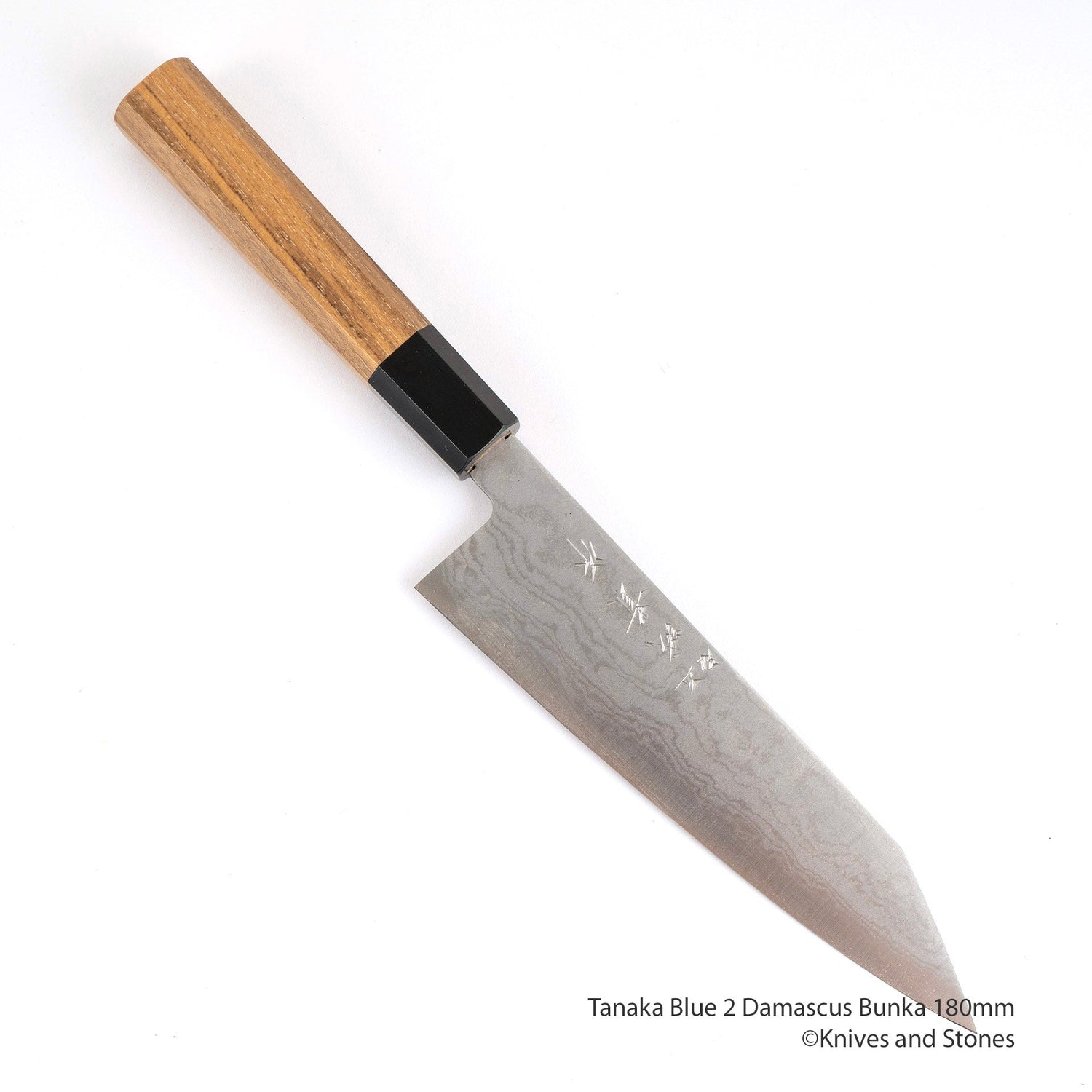 A staple line from Shigeki Tanaka, with 33-layer damascus cladding (iron) and a hitachi blue 2 steel core. While the Tanaka doesn't come with a superb fit and finish, the blue 2 damascus line is probably one of the best cuttings in its league.