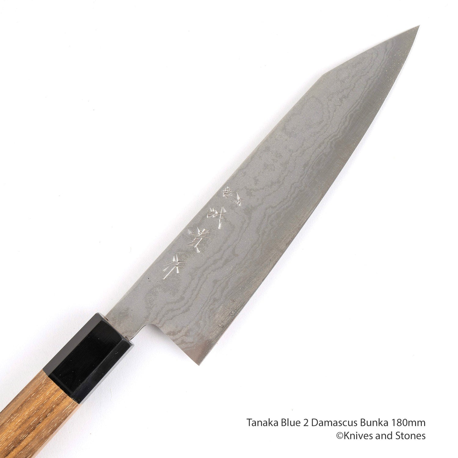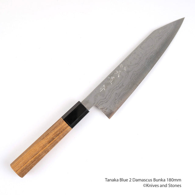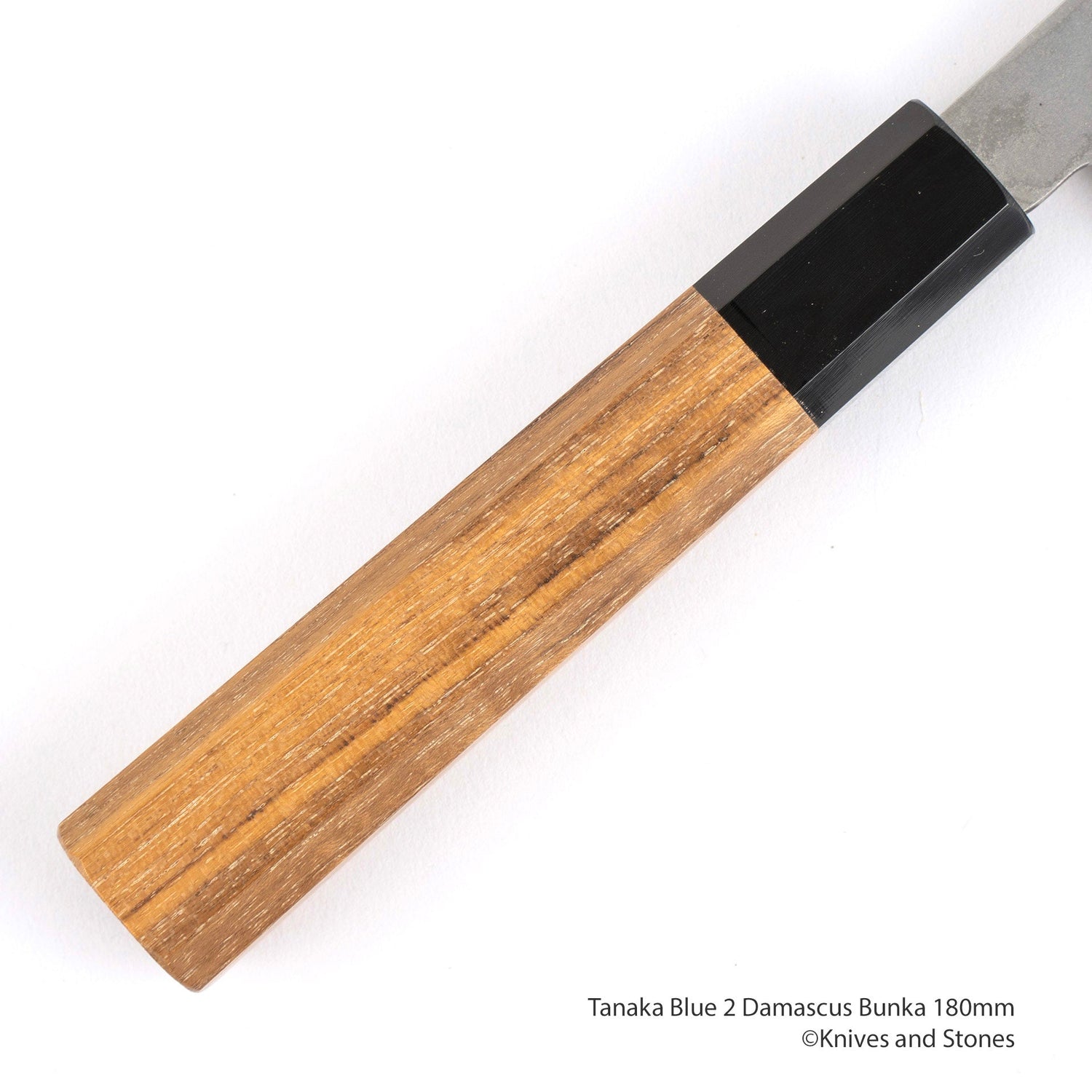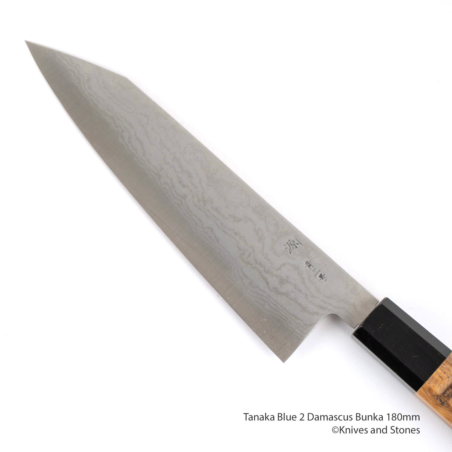 A staple line from Shigeki Tanaka, with 33-layer damascus cladding (iron) and a hitachi blue 2 steel core. While the Tanaka doesn't come with a superb fit and finish, the blue 2 damascus line is probably one of the best cuttings in its league.
