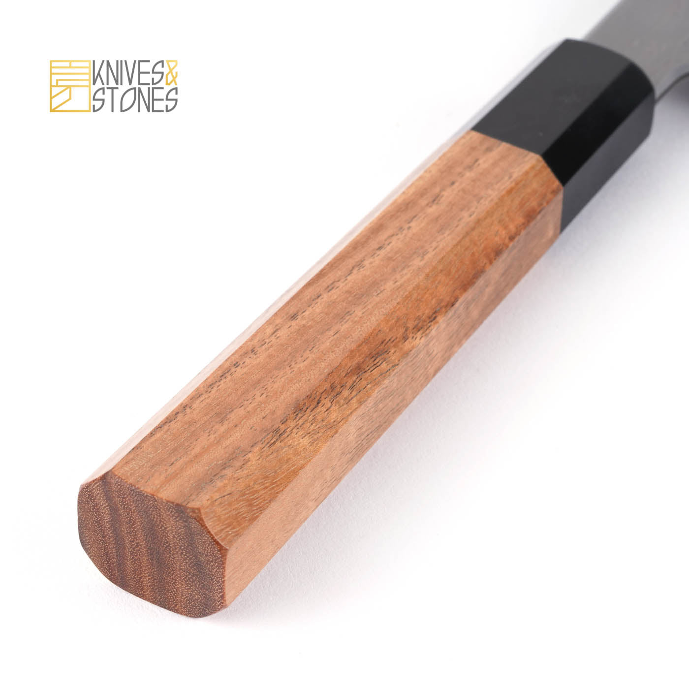 I think 'refined' is the best word to describe Naohito's work: while featuring proven cutting performance, his knife has some of the best finishes out there. The spine is nicely chamfered, choil is well polished. By engraving his name Naohito on to the knivves, you can tell that he must be really proud of his work, and I trust you will enjoy his knife as well.