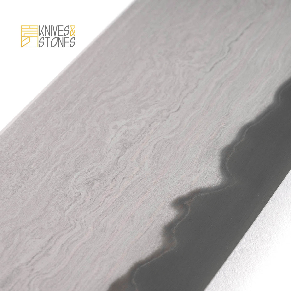 I think this pic below is self-explanatory: the Tanryusen features some highly visible forging cloud on the iron cladding, very similar to the much loved and elusive Shigefusa cloud. The difference is that, often this type of forging lines are found on knives cladded with old wrought iron, which are usually rare and expensive; in contrast, the cladding cloud on Tanryusen is formed by great forging and sharpening techniques of the makers.