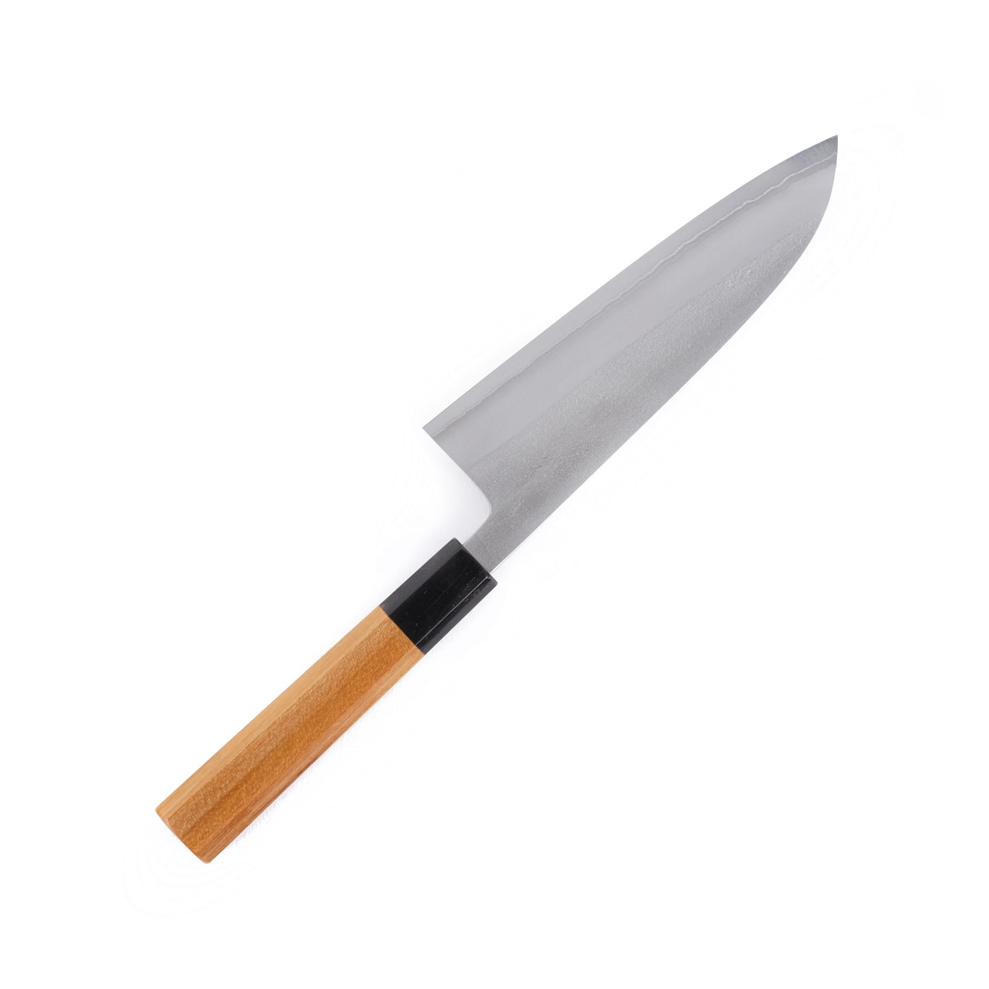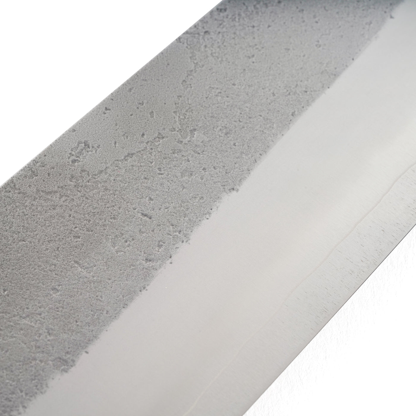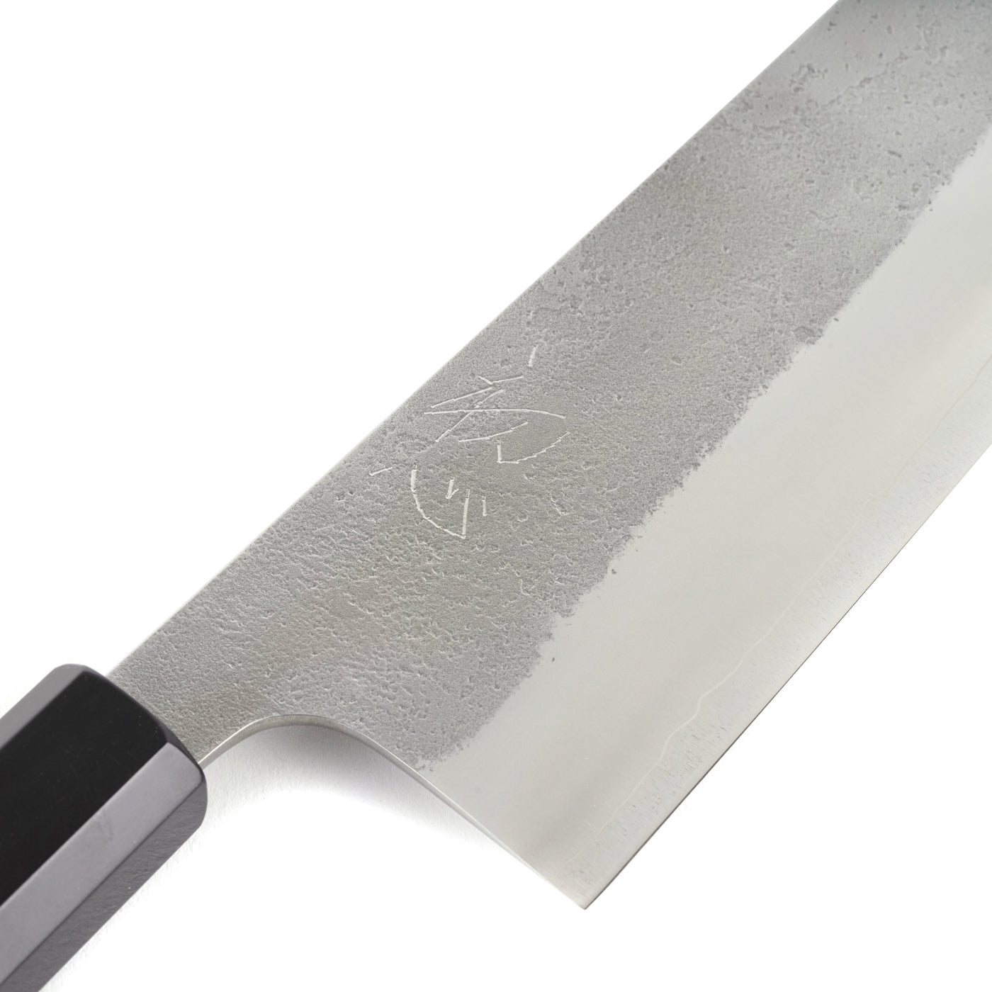 A rustic Nashiji finish coupled with a highly praised Sanjo region F&F. This knife has a very nice profile, large sweet spot, and feels very nimble in hand. SKD semi stainless core with stainless cladding ensure the highest cutting performance yet the stainless cladding means you will have little worry about the rust.