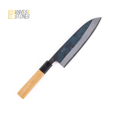 Hatsukokoro Blue 2 Damascus Santoku/Bunka 180mm with Kurouchi Finish and Teak Wood Handle
