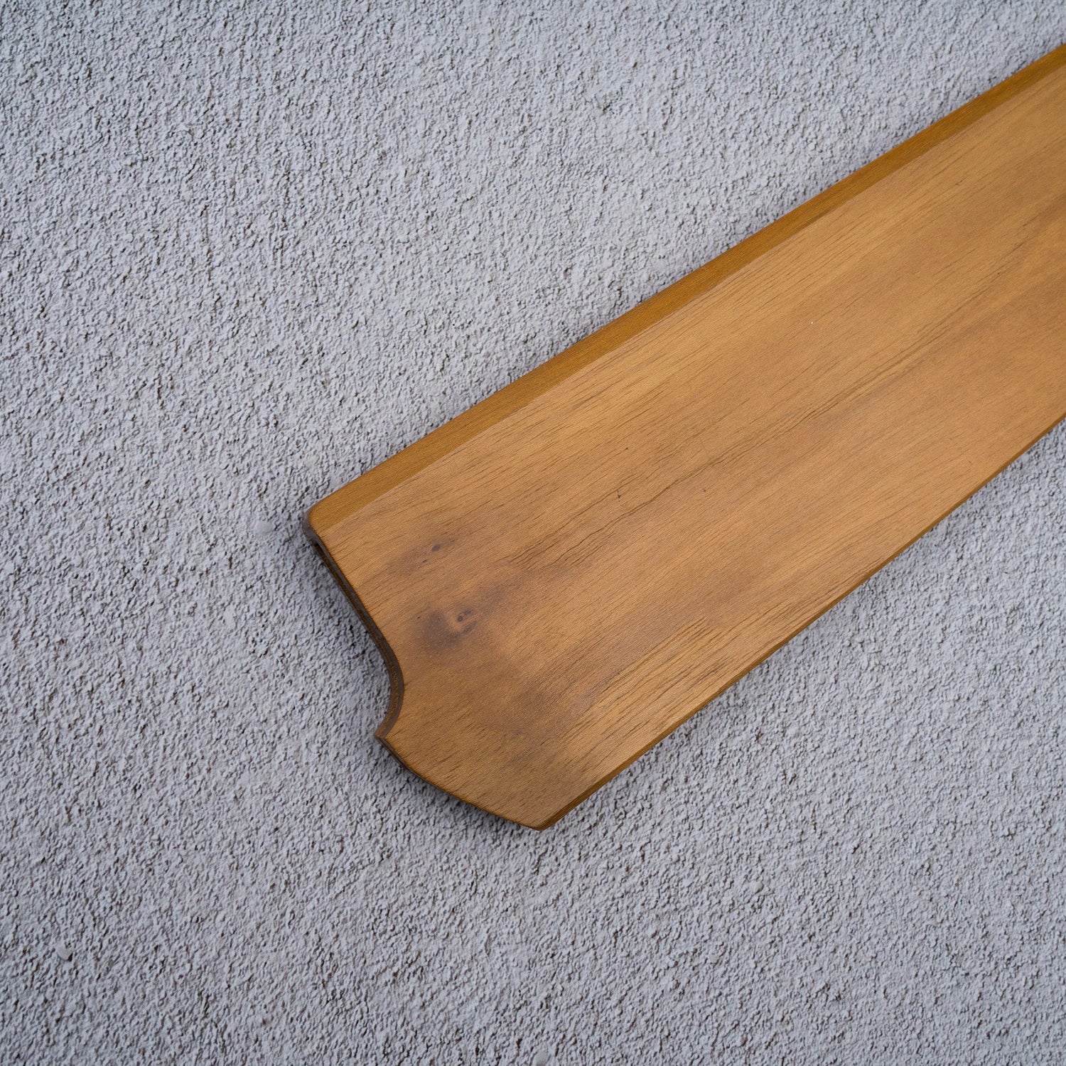 K&S Hardwood Gyuto saya. Comprised of Wenge and Teak timber. Sizes available for 210 / 240 and 270mm. However becasue Gyuto sizes varies by a lot, there are a few different main types: Sakai (standard) profile, Large profile (Takefu) and Think spine (Sanjo profile). Of course you can always opt-in the "Choose the right size for me" when you are purchasing the saya along with the knife.