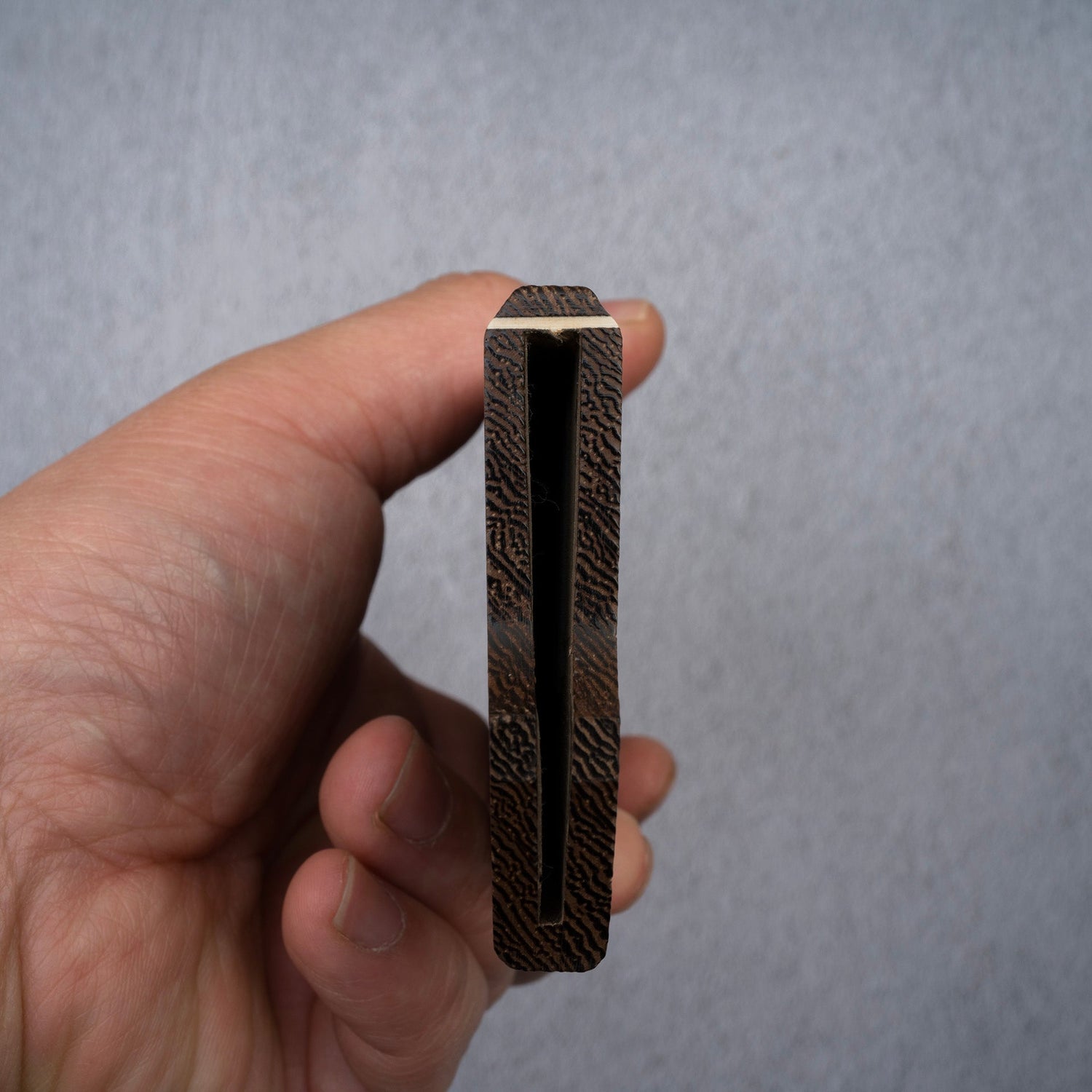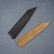 K&S Hardwood Gyuto saya. Comprised of Wenge and Teak timber. Sizes available for 210 / 240 and 270mm. However becasue Gyuto sizes varies by a lot, there are a few different main types: Sakai (standard) profile, Large profile (Takefu) and Think spine (Sanjo profile). Of course you can always opt-in the "Choose the right size for me" when you are purchasing the saya along with the knife.