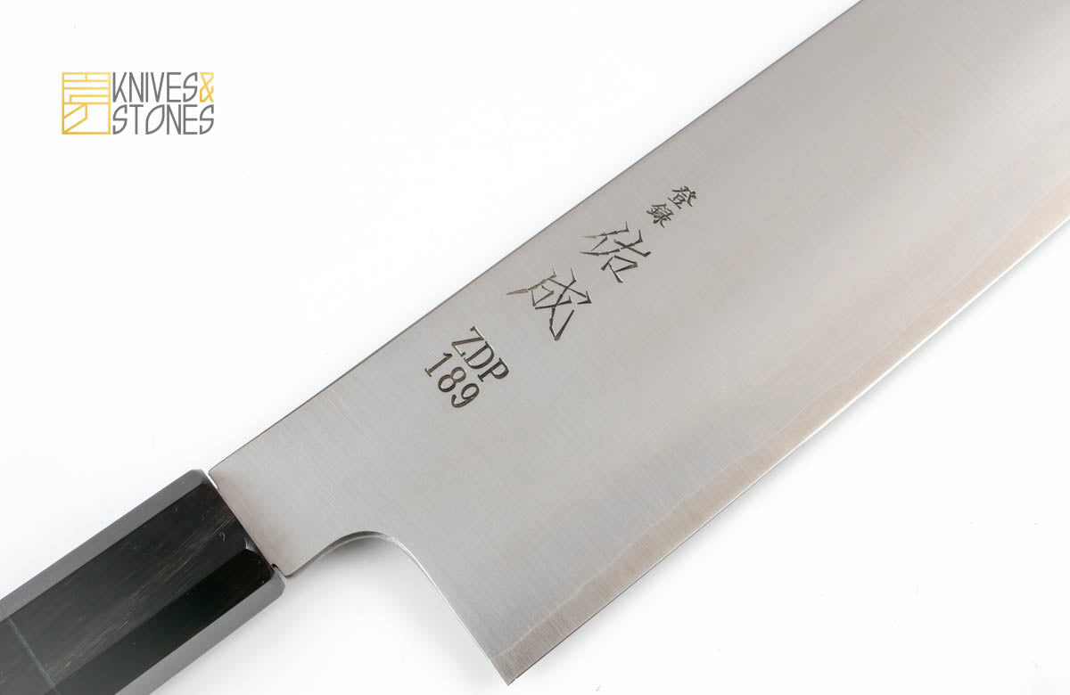 The Knives and Stones Sukenari ZDP-189 line is truely a beauty by the look, beast by the performance. The core steel is the most advanced powdered steel that Hitachi offers: the ZDP-189, reaching an unmatched hardness of HRC 65 to 67. This is acthieved by over 3% of Carbon content in the steel (White 2 has about 1%, Blue 1 has about 1.25%, that tells you something) meaning the Sukenari ZDP-189 will offer insance edge retention and sharpness. Yet it is a stainless steel becasue of the added Chromium. Overall, the ZDP-189 has very similar composition to the Cowry-X steel from Daido.