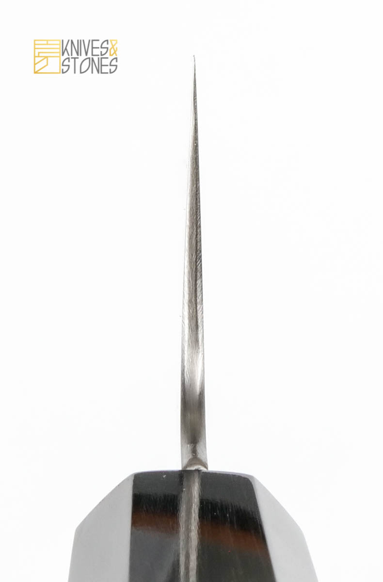 The ZDP-189 blade is forged with Nickel damascus stainless steel and mirror polished, along with the rounded choil and spine, super thin behind the edge, it is truely a master-piece from Master Hanaki Nobuo.