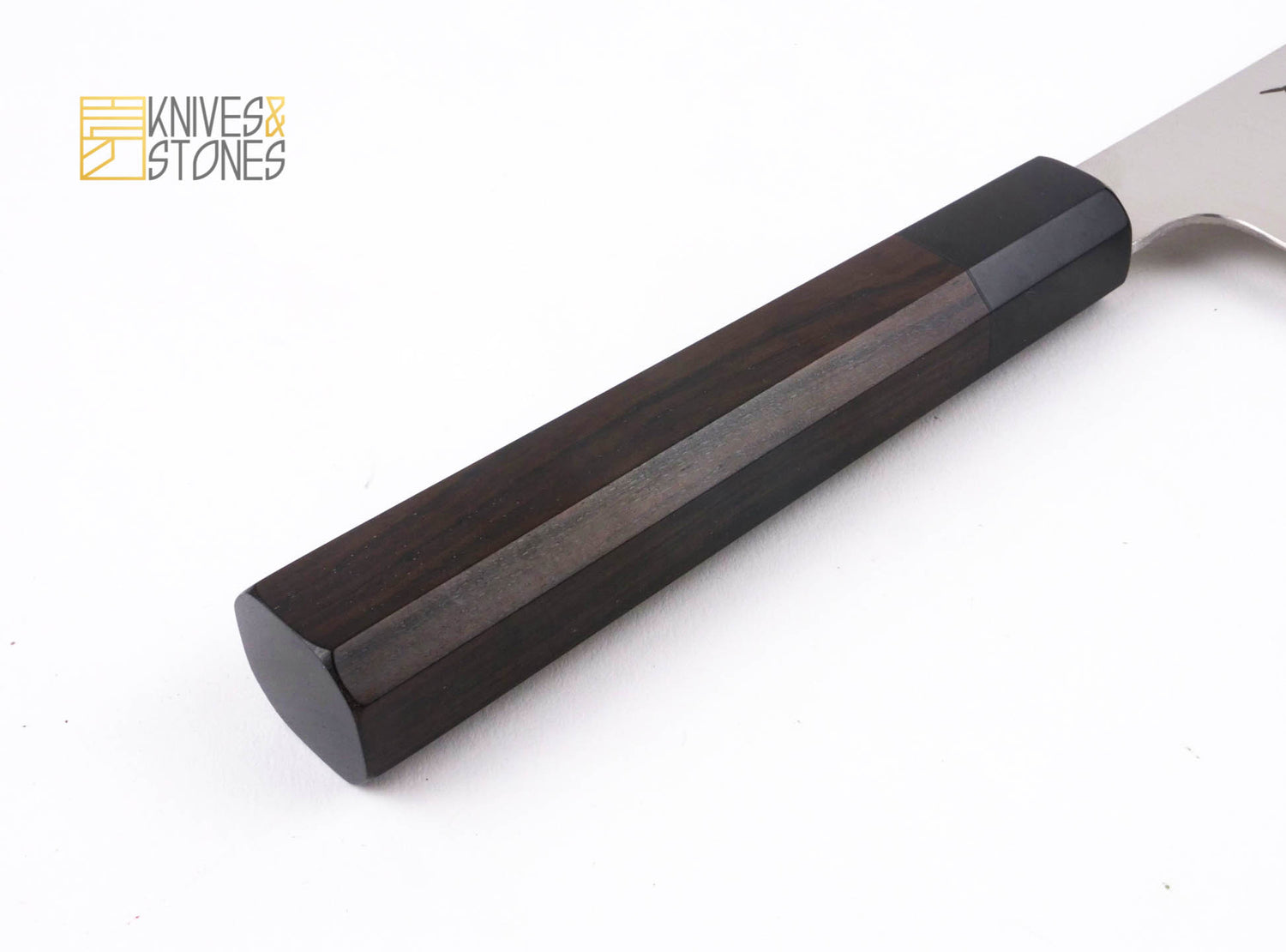 The Aogami Super line is arguably one of the most underrated offering from Sukenari. The reason? While staying at a very affordable price, the Sukenari Aogami Super is forged and water quenched to an extremely high hardness of HRC 65 (previously, the damascus version was even higher, more than HRC 66). This means a super high hardness, extreme sharpness and edge retention, but it also comes with an extremely high failure rate.