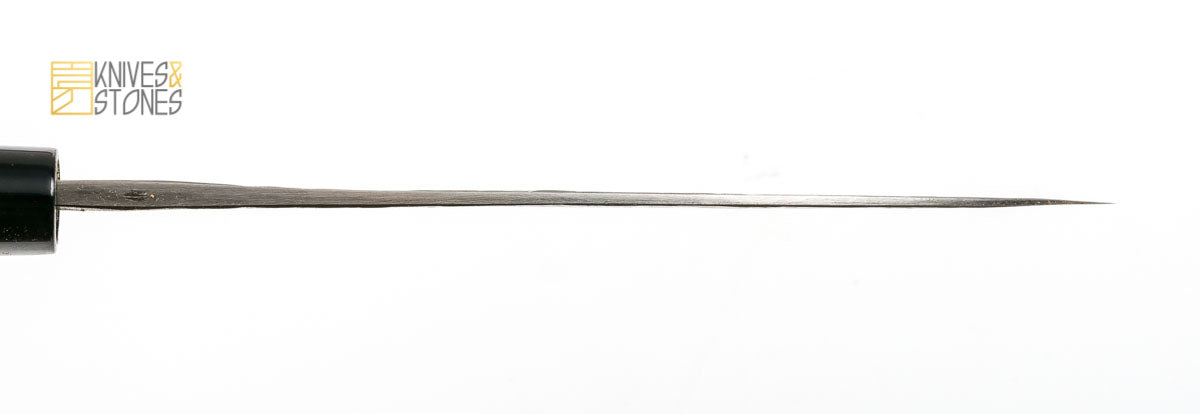 • Thick spine at the heel, aggressive taper to the tip, compound with a very thin grind behind the edge, giving the knife excellent cutting performance with great food release.
